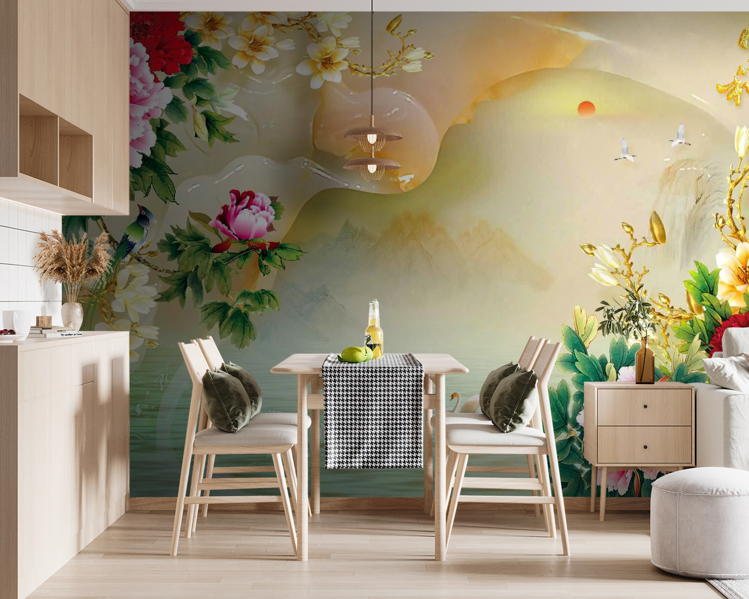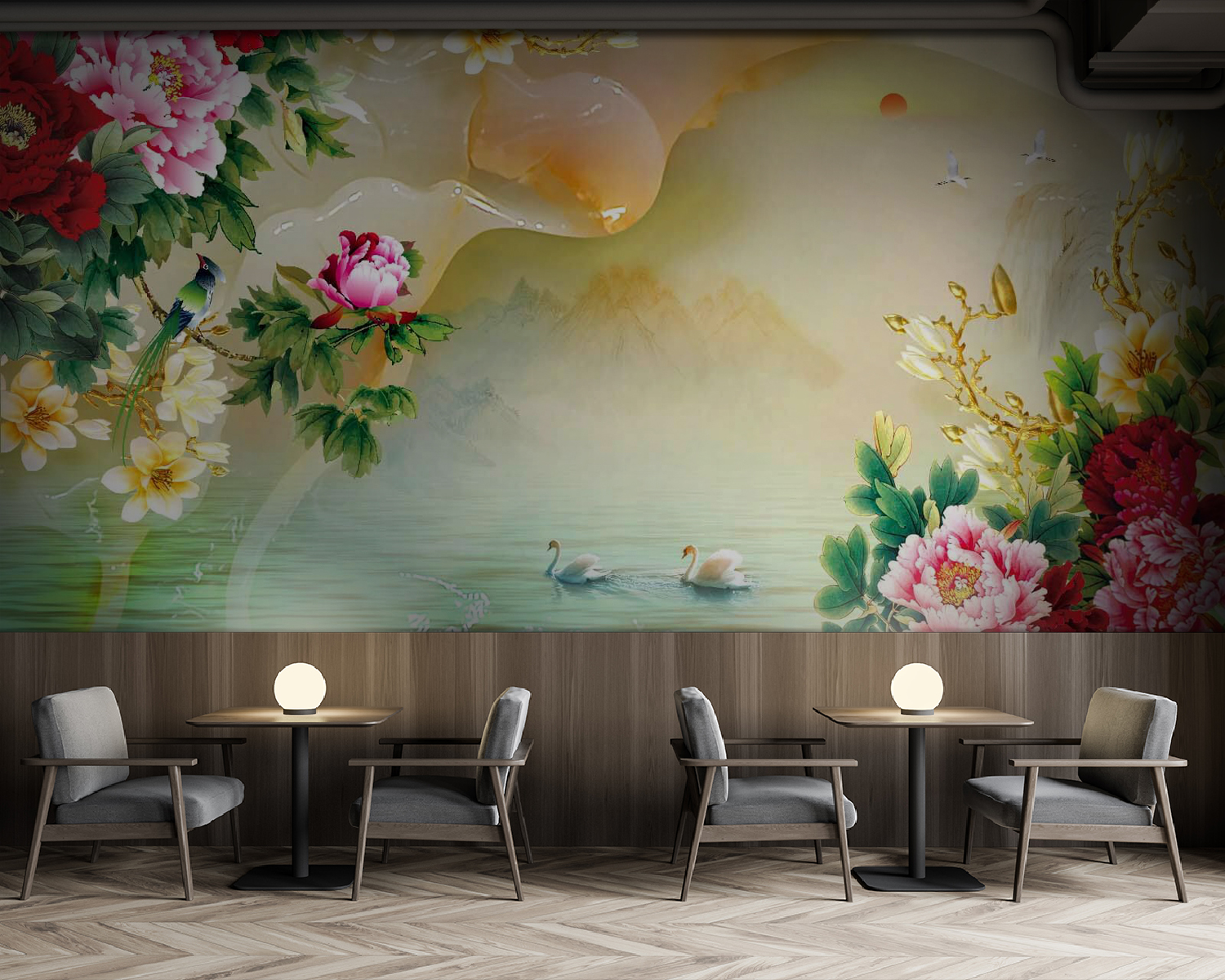 Verander elke ruimte in een rustige oase met deze betoverende muurschildering met levendige bloemen en sierlijke zwanen. De pioenrozen bloeien in kleurrijke tinten en creëren een levendige sfeer, terwijl de serene zwanen over een dromerig wateroppervlak glijden en uitnodigen tot een ontspannen middagje staren. Stel je voor dat je hier thee drinkt en het gevoel hebt dat je in een aquarelschilderij bent beland. Dit kunstwerk is perfect voor accentmuren of gezellige hoekjes en combineert moeiteloos de schoonheid van de natuur met je interieur. Het is niet alleen kunst, het is een uitnodiging om even stil te staan, adem te halen en wat meer van het leven te genieten.