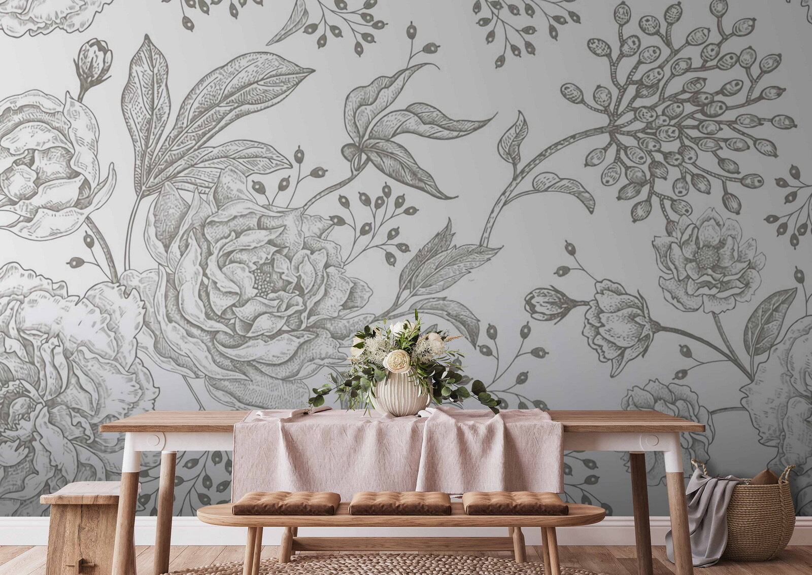 Transformeer uw ruimte met deze prachtige muurschildering met delicate bloemmotieven in zachte tinten. Stel u voor dat u wakker wordt met een zachte waterval van pioenrozen en sierlijke knoppen, alsof de natuur zelf heeft besloten om zich op uw muur te vestigen. Deze muurschildering is niet alleen mooi, maar ook als een verademing voor uw kamer. Perfect voor een gezellig hoekje of een serene slaapkamer, het straalt rust uit met zijn zachte kleuren en gedetailleerde details. Bovendien is het een geweldige gespreksstarter! Vrienden zullen je vragen waar je dit dromerige bloemenmeesterwerk hebt gevonden. Haal een beetje tuinmagie in huis – wie wil dat nou niet?