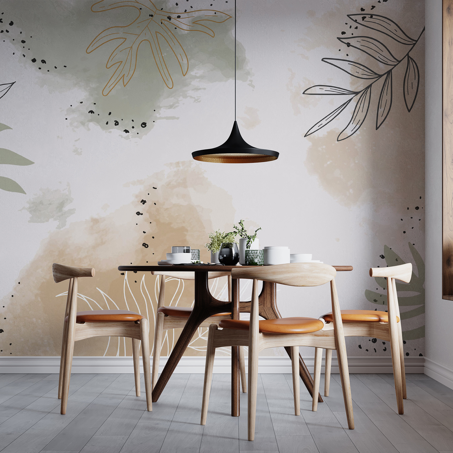 Dus je wilt een ruimte opvrolijken met een vleugje natuur? Dan is deze muurschildering “Drawing of a Leaf” misschien iets voor jou. Het zijn deze superchille bladschetsen op een zachte, aquarelachtige achtergrond. Stel je een knus hoekje voor waar je tot rust komt met een kopje thee. De gedempte groene en beige tinten geven een serene, bijna zen-achtige uitstraling. Perfect om een saaie muur om te toveren in een stukje rust. Het is alsof je een vleugje buiten naar binnen brengt zonder de insecten! Stel je eens voor hoe ontspannen je je zou voelen. Ook gemakkelijk te combineren met een heleboel decoraties. Geef je muren een beetje liefde voor bladeren!