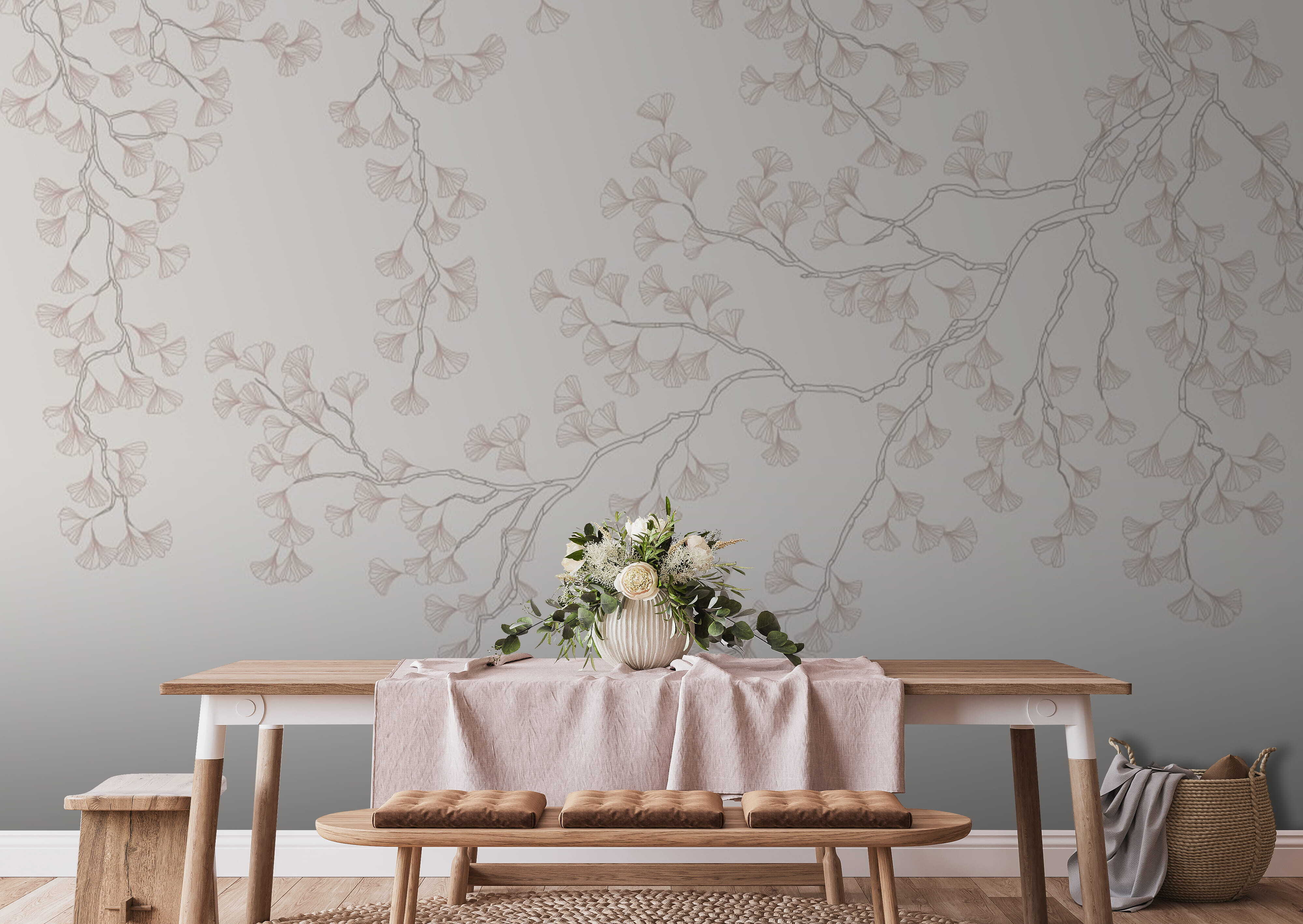 Laten we het eens hebben over de muurschildering “Vloeiend patroon van ginkgo-takken”. Stel je eens voor dat je een kamer binnenstapt waar deze delicate lijnen en zachte kleurschakeringen van ginkgo-takken moeiteloos over de muur stromen. Het is alsof je een stukje serene natuur in huis haalt. Perfect voor elke kamer waar je een vleugje kalme elegantie wilt. De takken lijken bijna te wiegen in een zacht briesje – je zou jezelf zelfs kunnen betrappen op dagdromen terwijl je ernaar staart. Of het nu in je woonkamer, slaapkamer of zelfs een gezellig leeshoekje is, deze muurschildering verandert een gewone muur in een rustige ontsnapping.