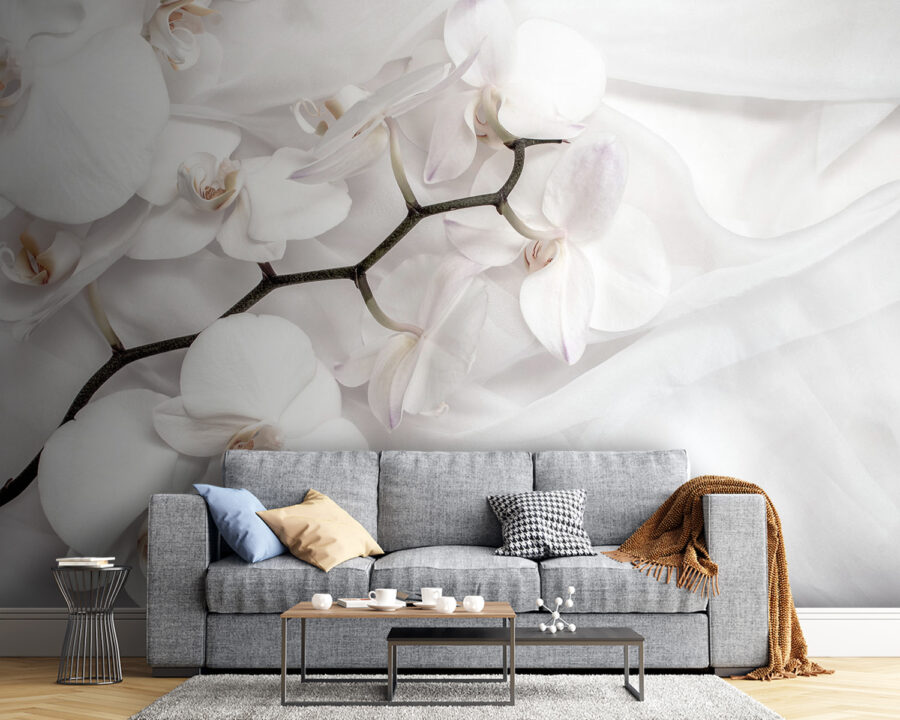 Transformeer elke kamer met deze prachtige muurschildering met delicate witte orchideeën op een zachte, witte stoffen achtergrond. Stel je voor dat je ruimte aanvoelt als een serene tuinoase – perfect voor die dagen waarop je even wilt ontsnappen aan de chaos van het leven. De elegante bloemen voegen een vleugje rust toe, waardoor het moeilijk is om niet te glimlachen telkens als je erlangs loopt.