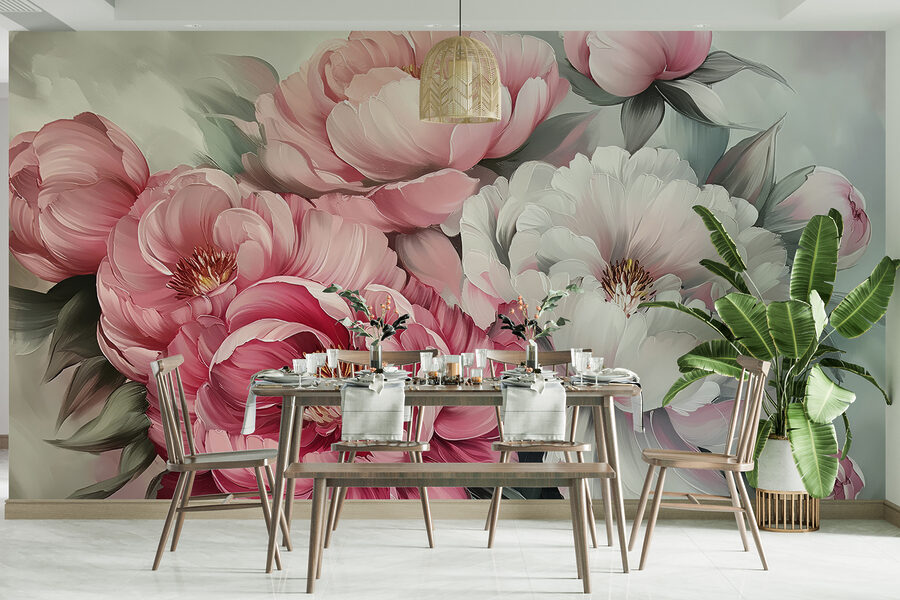 Tover elke kamer om in een bloeiend paradijs met deze levendige muurschildering met een prachtige groep bloemen tussen weelderige bladeren. Stel je voor dat je een ruimte binnenstapt die levendig aanvoelt, waar elke blik zachte bloemblaadjes en delicate tinten onthult die zelfs de saaiste dag opfleuren. Het is alsof je je eigen tuin hebt, zonder de vervelende bijen! Of het nu in een gezellig leeshoekje is of in een elegante eethoek, deze muurschildering nodigt uit tot een gevoel van rust en schoonheid. Dus ga je gang, laat die bloemenvibes je huis overspoelen. Het is net zo verfrissend als een lenteochtend – zonder de allergieën.