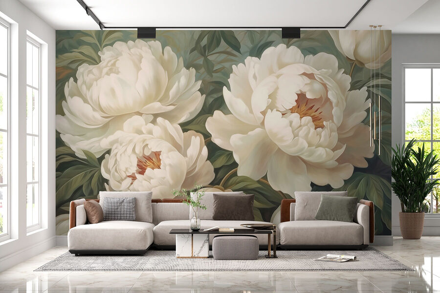 Transformeer elke kamer met deze betoverende muurschildering met weelderige bloesems van delicate witte bloemblaadjes. Stel je eens voor dat je een ruimte binnenloopt waar zachte pioenrozen het licht vangen, waardoor de hele plek aanvoelt als een sereen toevluchtsoord in de tuin. Het is perfect voor die dagen dat de buitenwereld een beetje te chaotisch aanvoelt – kijk er gewoon naar en *adem*.