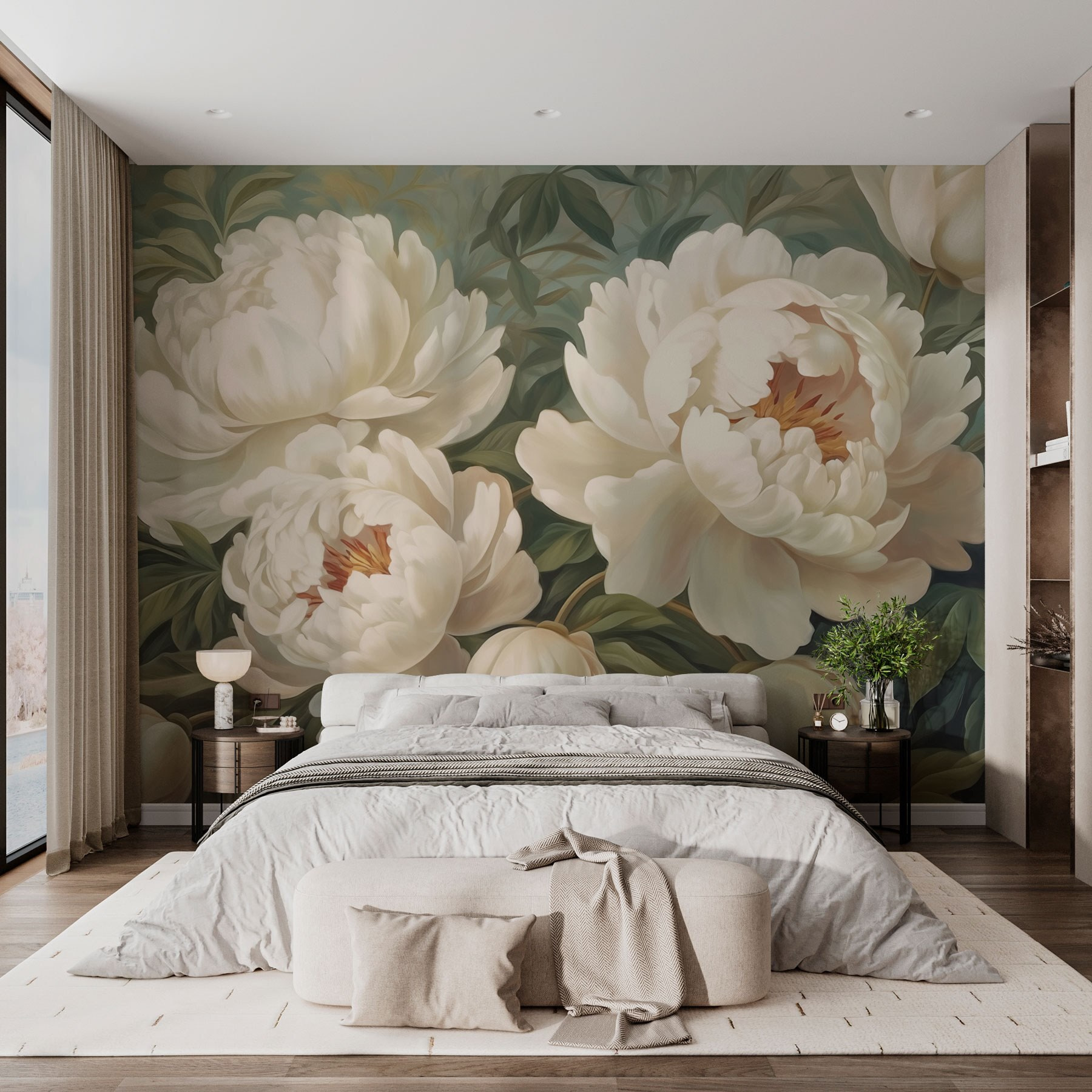 Transformeer elke kamer met deze betoverende muurschildering met weelderige bloesems van delicate witte bloemblaadjes. Stel je eens voor dat je een ruimte binnenloopt waar zachte pioenrozen het licht vangen, waardoor de hele plek aanvoelt als een sereen toevluchtsoord in de tuin. Het is perfect voor die dagen dat de buitenwereld een beetje te chaotisch aanvoelt – kijk er gewoon naar en *adem*.