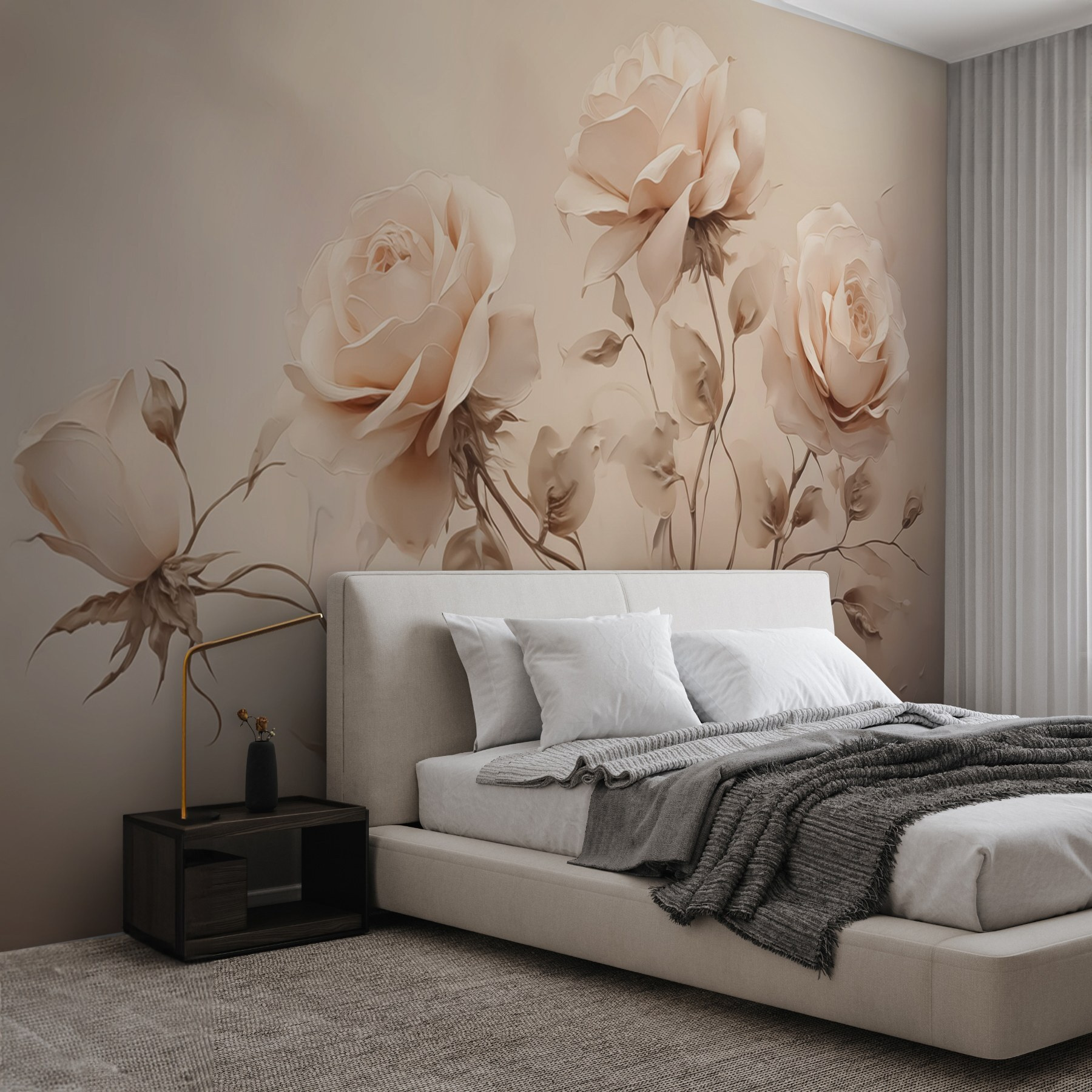 Transformeer je ruimte met deze prachtige muurschildering met een mooie groep rozen. Stel je voor dat je een kamer binnenloopt die aanvoelt als een serene tuin – zachte bloemblaadjes en zachte bladeren die een gezellige, uitnodigende sfeer creëren. Het is bijna alsof je de schoonheid van de natuur binnenshuis haalt, zonder de gieter en vervelende insecten. Stel je voor: thee drinken op een regenachtige dag, met deze sierlijke bloemen die alles een warm en vrolijk gevoel geven. Of het nu de woonkamer is of een leeshoekje, deze muurschildering hult je muren in elegantie en herinnert je eraan dat schoonheid binnen handbereik is. Perfect voor iedereen die een beetje bloemenmagie door zijn huis wil strooien. Wie zou dat niet willen?