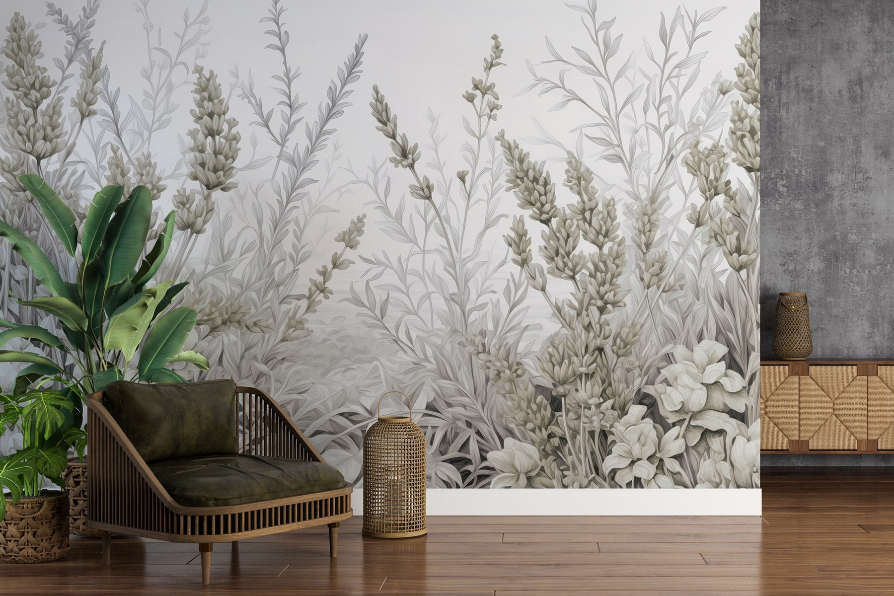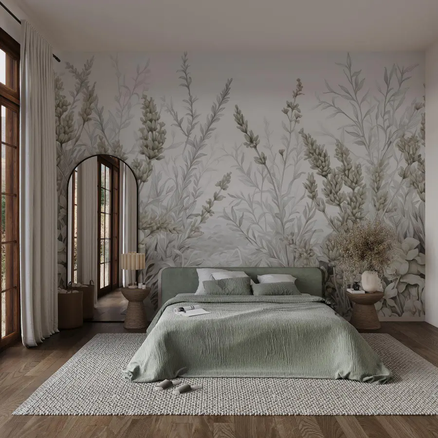 Verander elke ruimte in een rustige ontsnapping met deze prachtige muurschildering. Het serene botanische arrangement fluistert elegantie in gedempte tinten en brengt een vleugje natuur in huis. Stel je voor dat je na een lange dag thuiskomt, op je bank neerploft en begroet wordt door zachte lavendel en delicaat groen. Het is als een rustgevende knuffel voor je muren. Deze muurschildering is perfect voor een knusse leeshoek of een rustige slaapkamer en zorgt voor een ontspannende sfeer. Je hoeft geen water te geven of te snoeien! Voeg een vleugje zen toe aan je inrichting en laat je muren het woord doen.