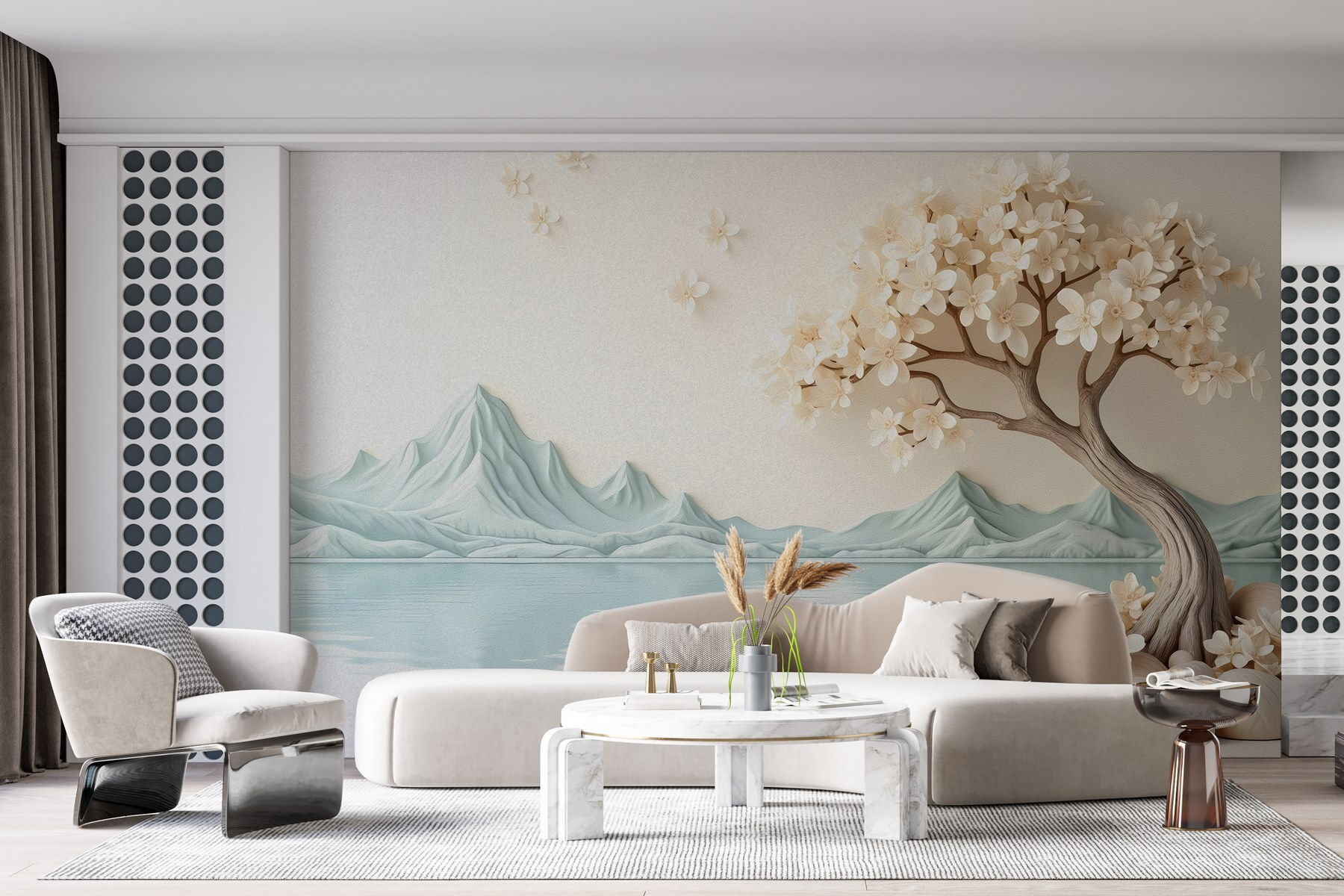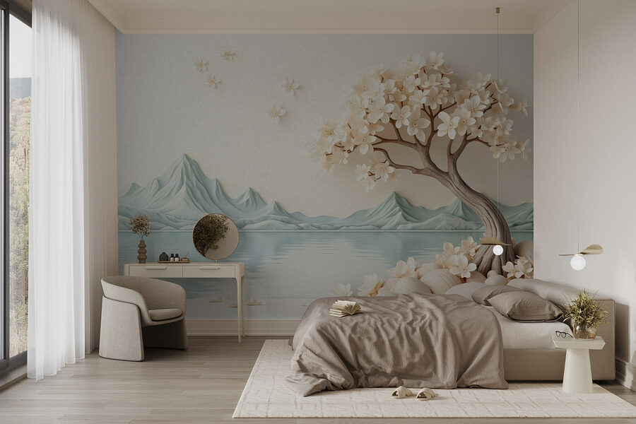 Verander uw ruimte in een serene toevluchtsoord met deze prachtige muurschildering, “Boom met bloemen en rotsen naast water”. Stelt u zich eens voor: een prachtig vormgegeven boom vol delicate bloemen, die gracieus over een rustig wateroppervlak hangt. Het is alsof u een stukje natuur in uw woonkamer uitnodigt. De zachte kleuren en vloeiende lijnen zorgen direct voor een rustige sfeer, perfect om achterover te leunen met een kopje thee – of misschien zelfs een lekker hapje. En laten we eerlijk zijn, wie heeft er nou geen serene achtergrond nodig tijdens het bingewatchen van zijn favoriete series? Deze muurschildering is meer dan alleen decoratie; het is een dagelijkse herinnering om de kleine dingen te waarderen, zoals de schoonheid van een bloem of een rustig moment aan het water.