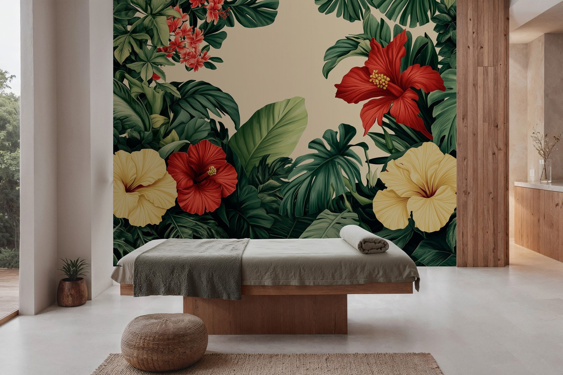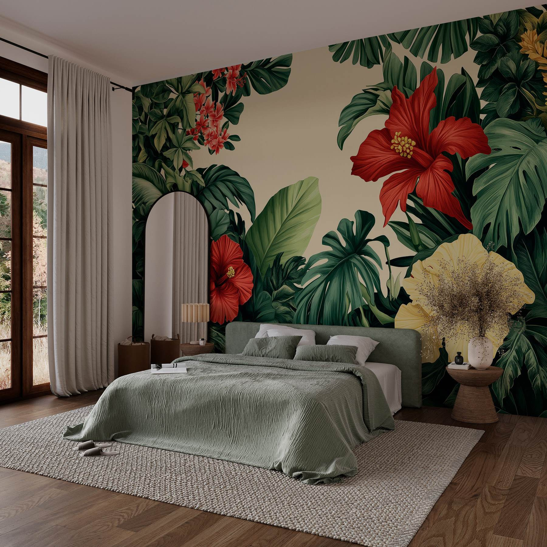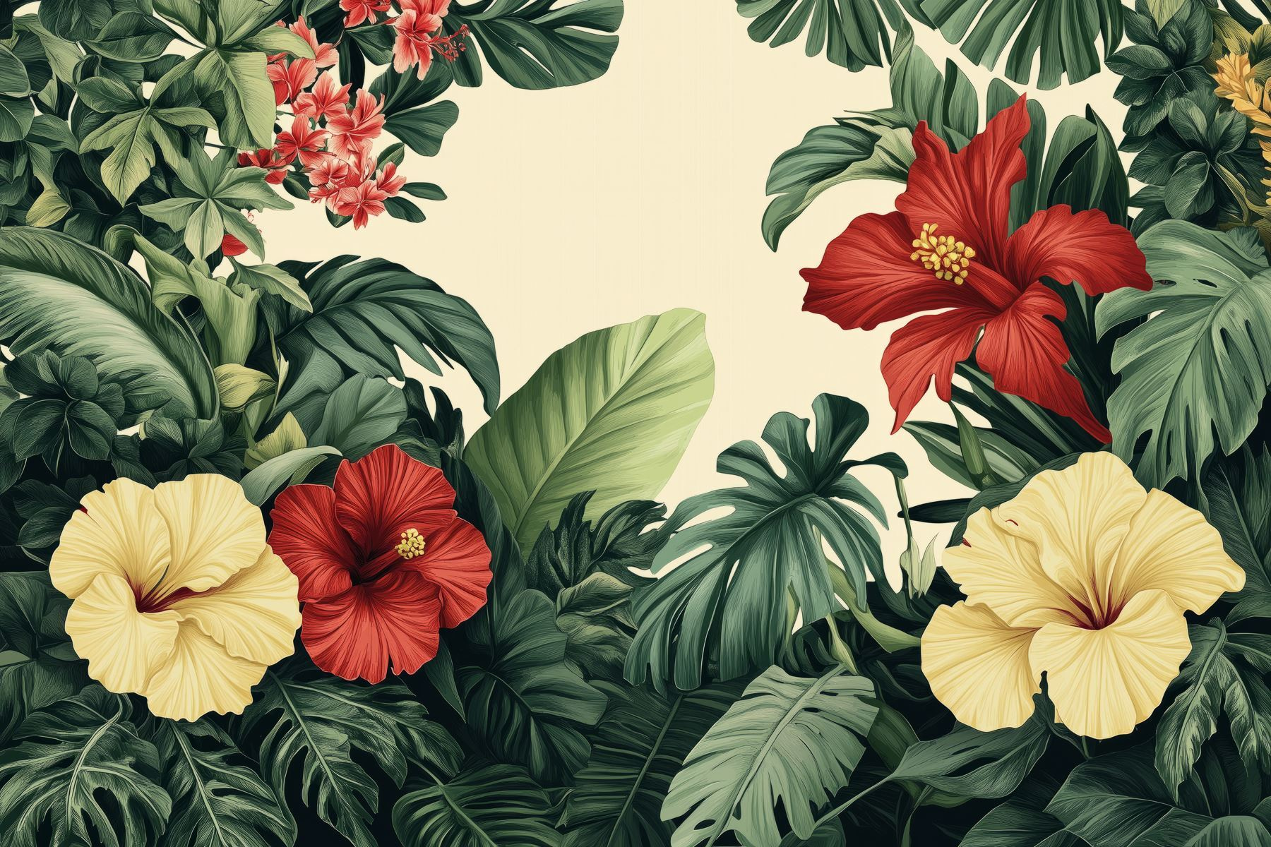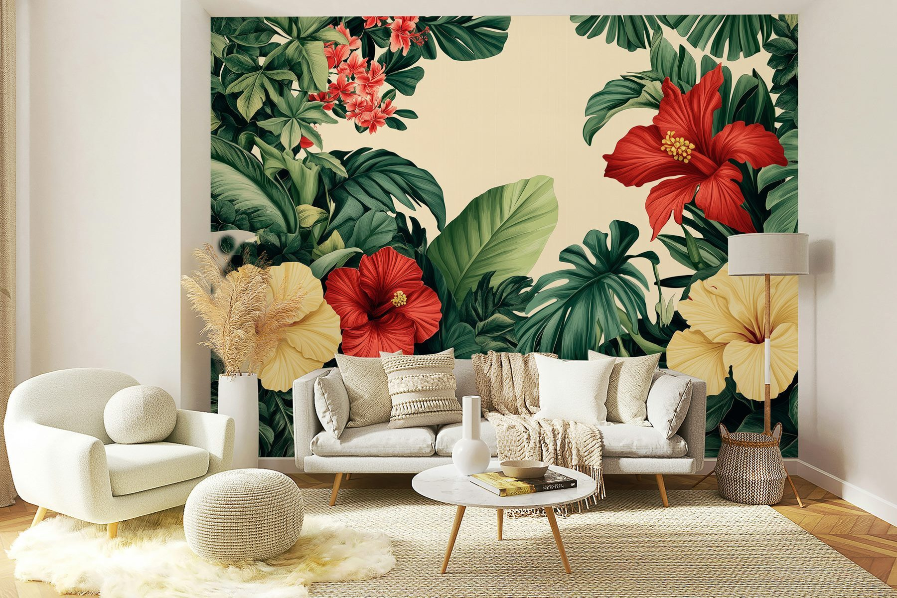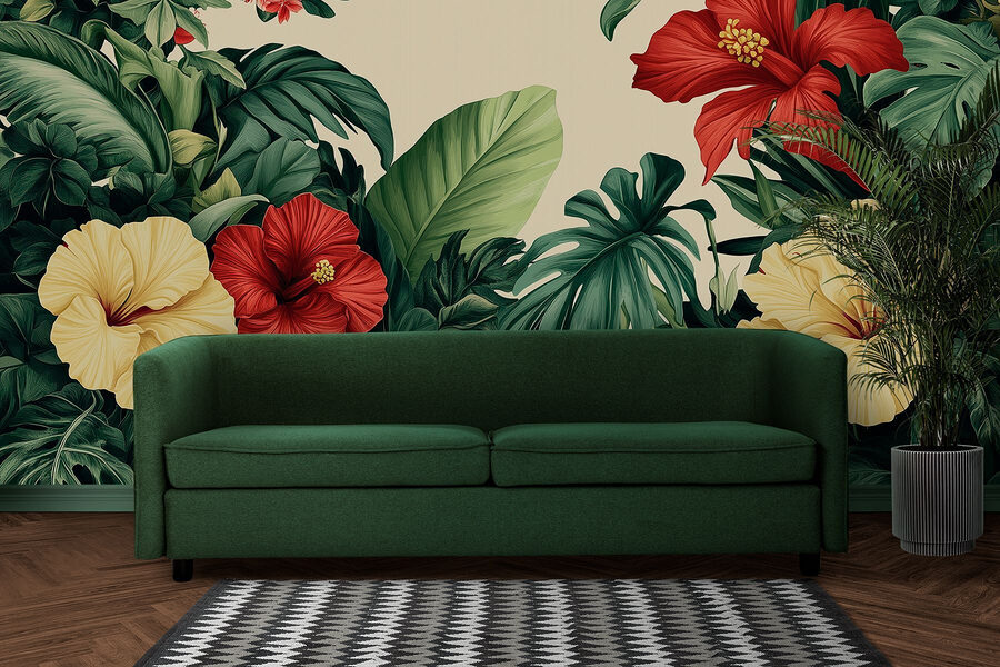Verander elke kamer in een tropisch toevluchtsoord met deze prachtige muurschildering met een levendige groep bloemen en weelderige bladeren. Stel je voor dat je je kamer binnenstapt en wordt begroet door opvallende hibiscusbloemen en diepgroene bladeren. Het is net een minivakantie thuis! Deze muurschildering voegt niet alleen kleur toe, maar ook een levendige sfeer, perfect om uw woonkamer op te fleuren of een vleugje natuur in een gezellig leeshoekje te brengen. Stelt u zich eens voor dat u van een drankje nipt terwijl u geniet van deze botanische schoonheid – pure gelukzaligheid! Perfect voor iedereen die verlangt naar een vleugje buitencharme zonder iets water te hoeven geven.