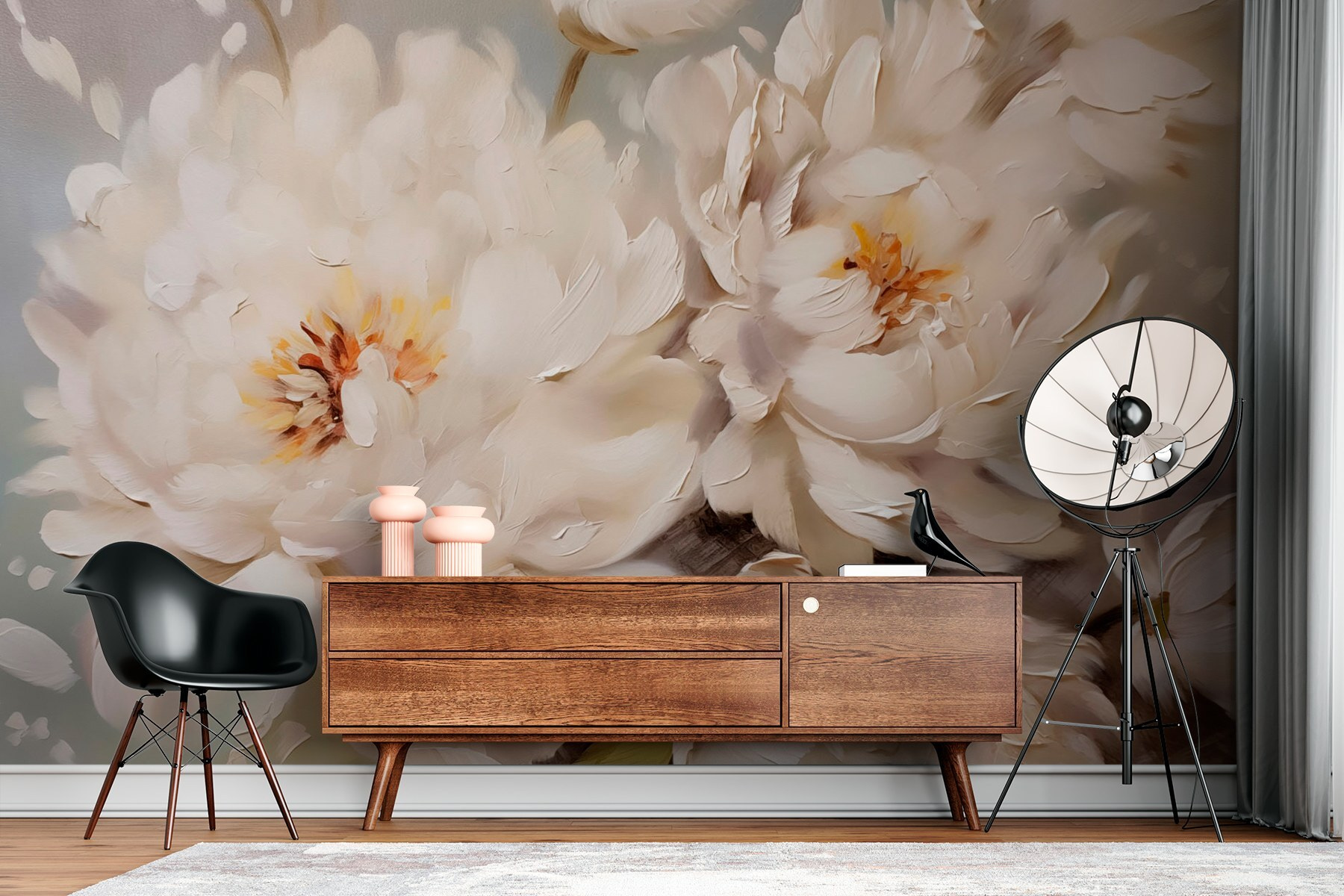 Transformeer je ruimte met deze betoverende muurschildering met delicate witte bloemen die zo van de muur af lijken te bloeien. Stel je voor dat je een serene tuin binnenstapt telkens als je de kamer binnenkomt – zachte bloemblaadjes springen in het oog en nodigen uit tot warmte en rust. Deze prachtige muurschildering voelt aan als een frisse wind, perfect om elke hoek van je huis op te fleuren. Stel je luie middagen voor die je doorbrengt onder het genot van een kopje thee, omringd door deze vredige schoonheid. Het is meer dan decor; het is een stukje natuur dat elegantie uitstraalt. Ook een perfect gespreksonderwerp voor gasten!