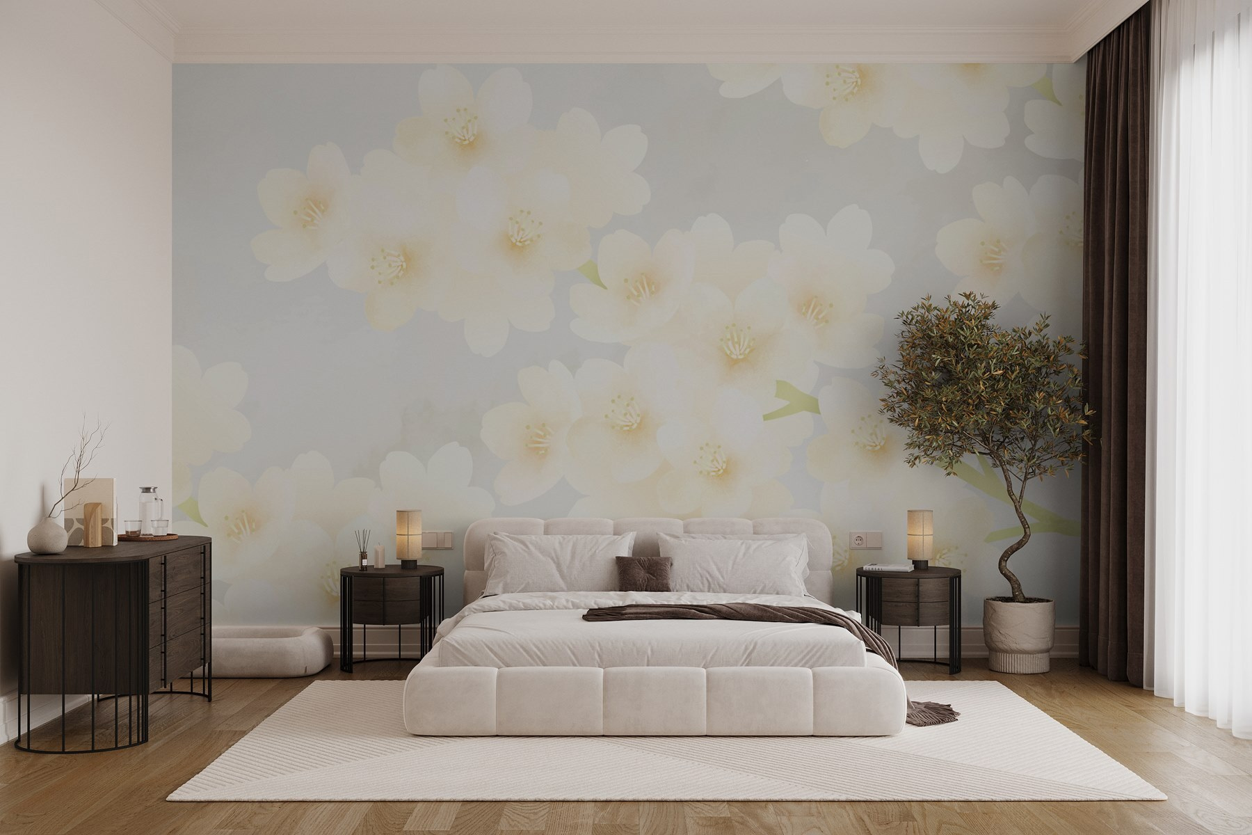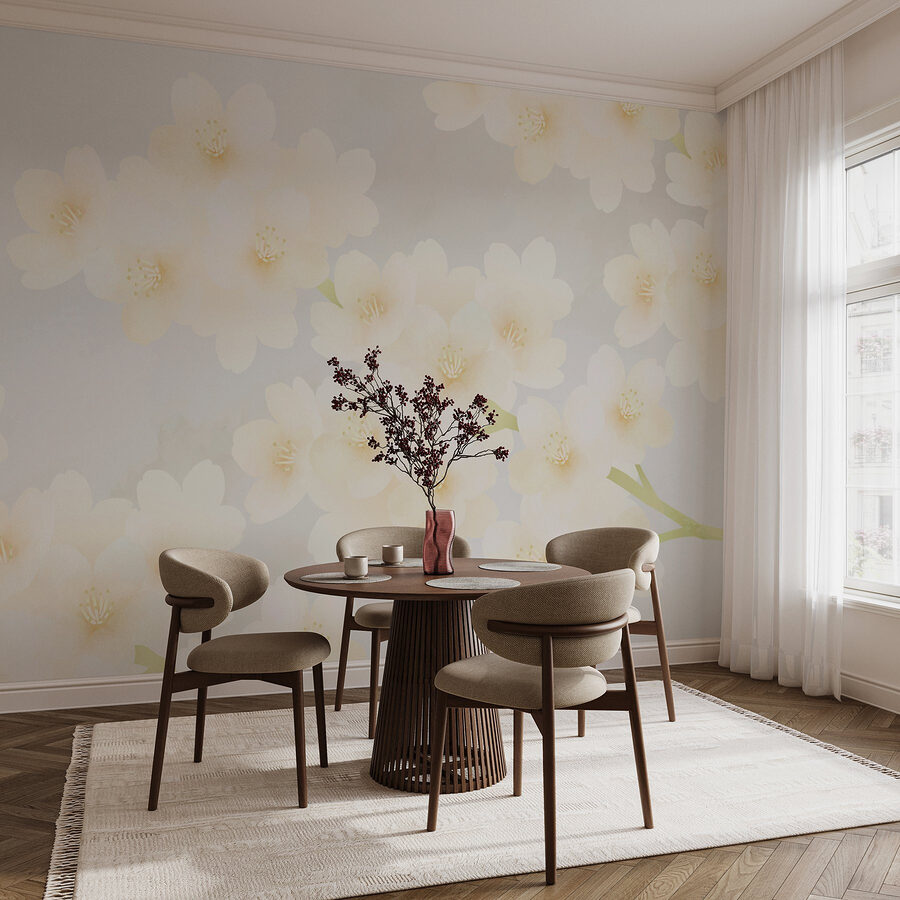 Fleur elke ruimte op met deze prachtige muurschildering met een charmante groep witte bloemen. Stel je voor: je loopt een kamer binnen die baadt in zacht zonlicht, en daar zijn ze, die delicate bloemen – als een uitnodiging van de natuur om te ontspannen. Deze muurschildering hangt niet alleen aan de muur, maar verandert de hele sfeer en creëert een serene oase in je eigen huis. Vrienden zullen even blijven staan om te bewonderen en misschien zelfs vragen of je een geheime tuin hebt. Perfect voor een gezellig hoekje of een inspirerende werkruimte, het voelt fris en toch tijdloos. Laat je muren een verhaal van schoonheid en rust vertellen!