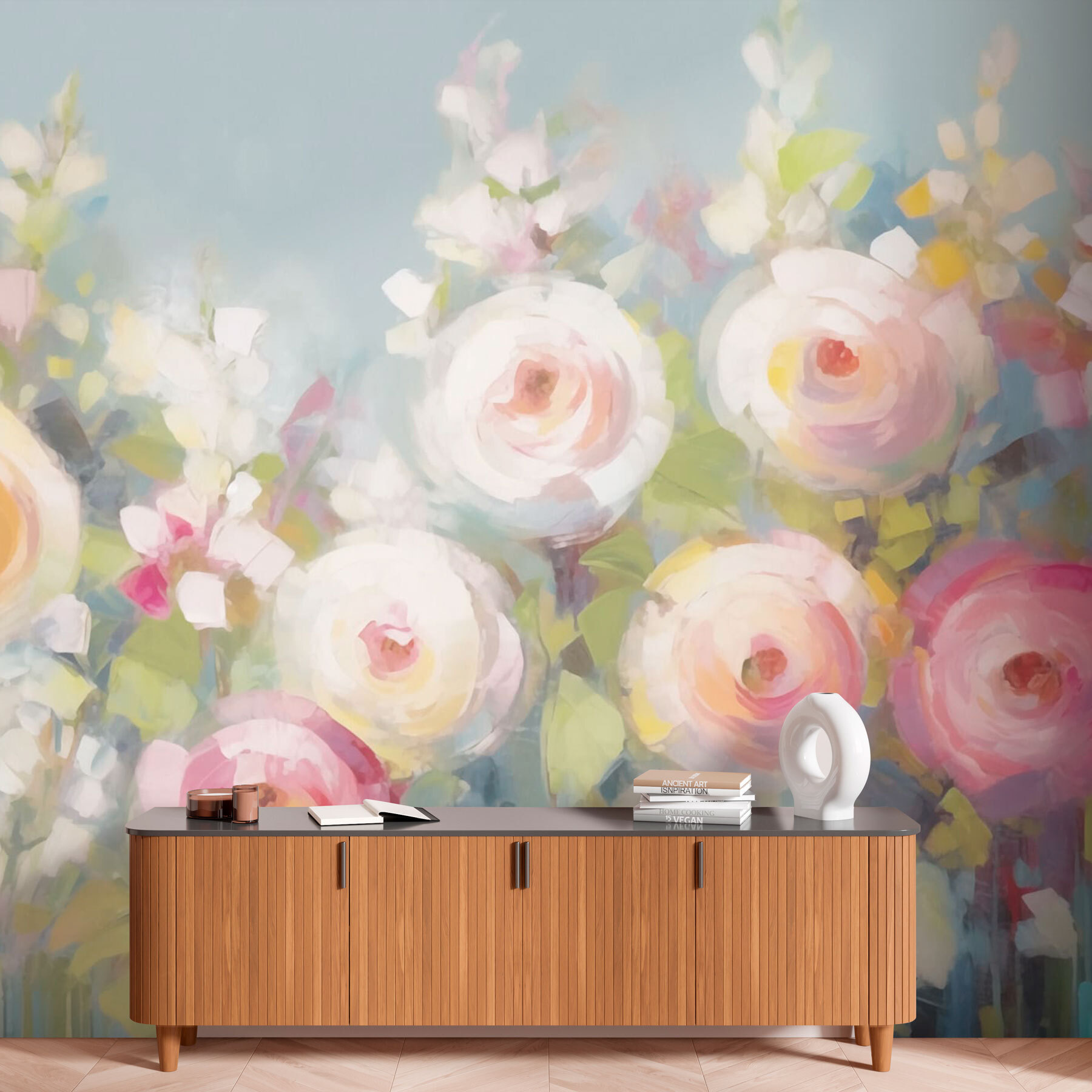 Transform any room into a blooming paradise with this stunning wall mural featuring vibrant flowers against a soft blue backdrop. The cheerful colors and flowing shapes invite a sense of warmth and tranquility, perfect for brightening up a cozy space. Imagine sipping your morning coffee, surrounded by these lovely blooms, as if spring has taken up permanent residence in your home. Whether it’s a living room, bedroom, or a creative nook, this mural brings a touch of nature indoors. It’s like having a garden without the watering can—who wouldn’t appreciate that? Seriously, this mural doesn’t just decorate; it uplifts!
