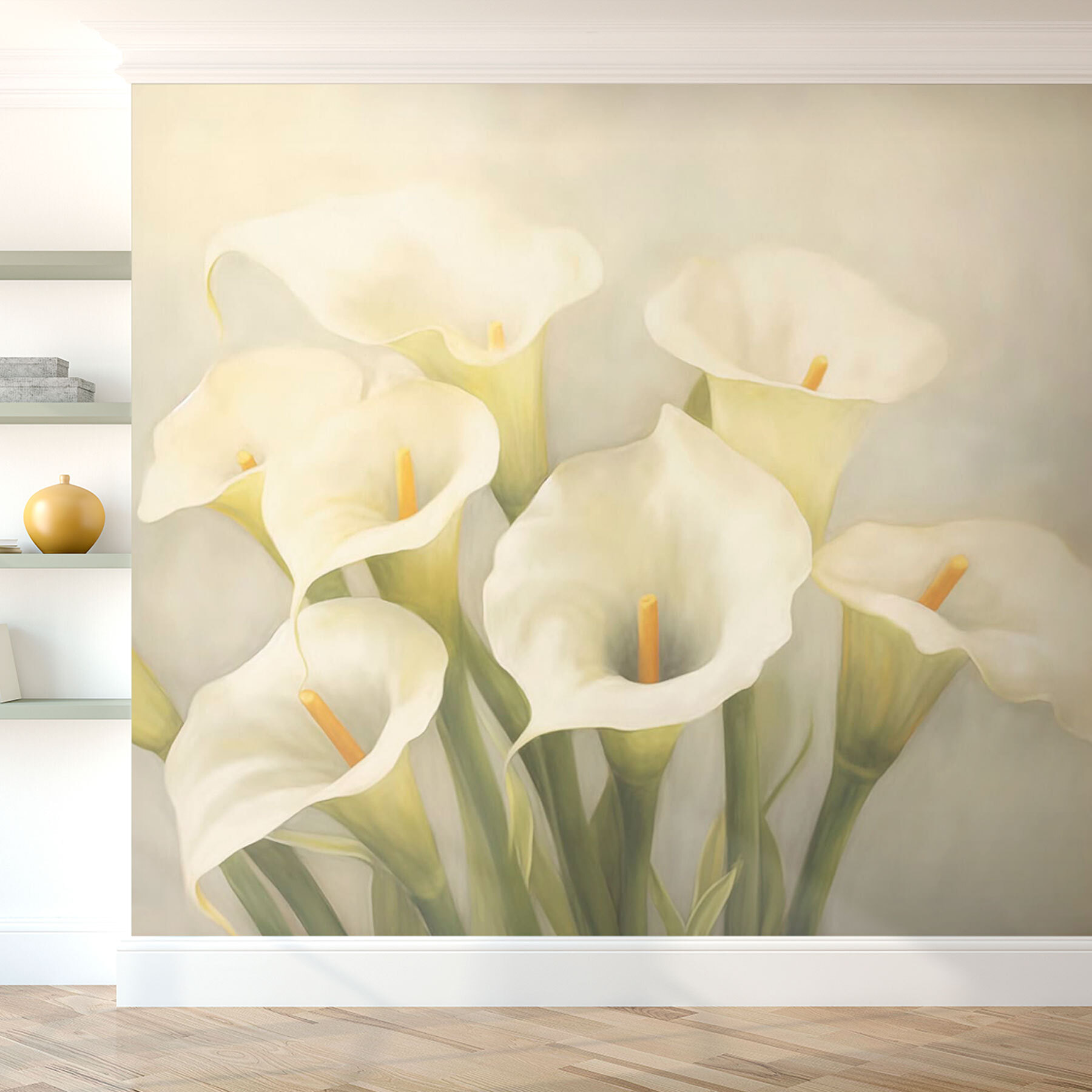 Transformeer uw ruimte met deze prachtige muurschildering met een sierlijke groep witte bloemen. Stel u voor dat u een kamer binnenloopt en wordt begroet door die zachte, serene sfeer – als een zachte knuffel van de natuur. De delicate bloemblaadjes en zachte tinten creëren een rustige sfeer die uitnodigt tot ontspanning en reflectie.