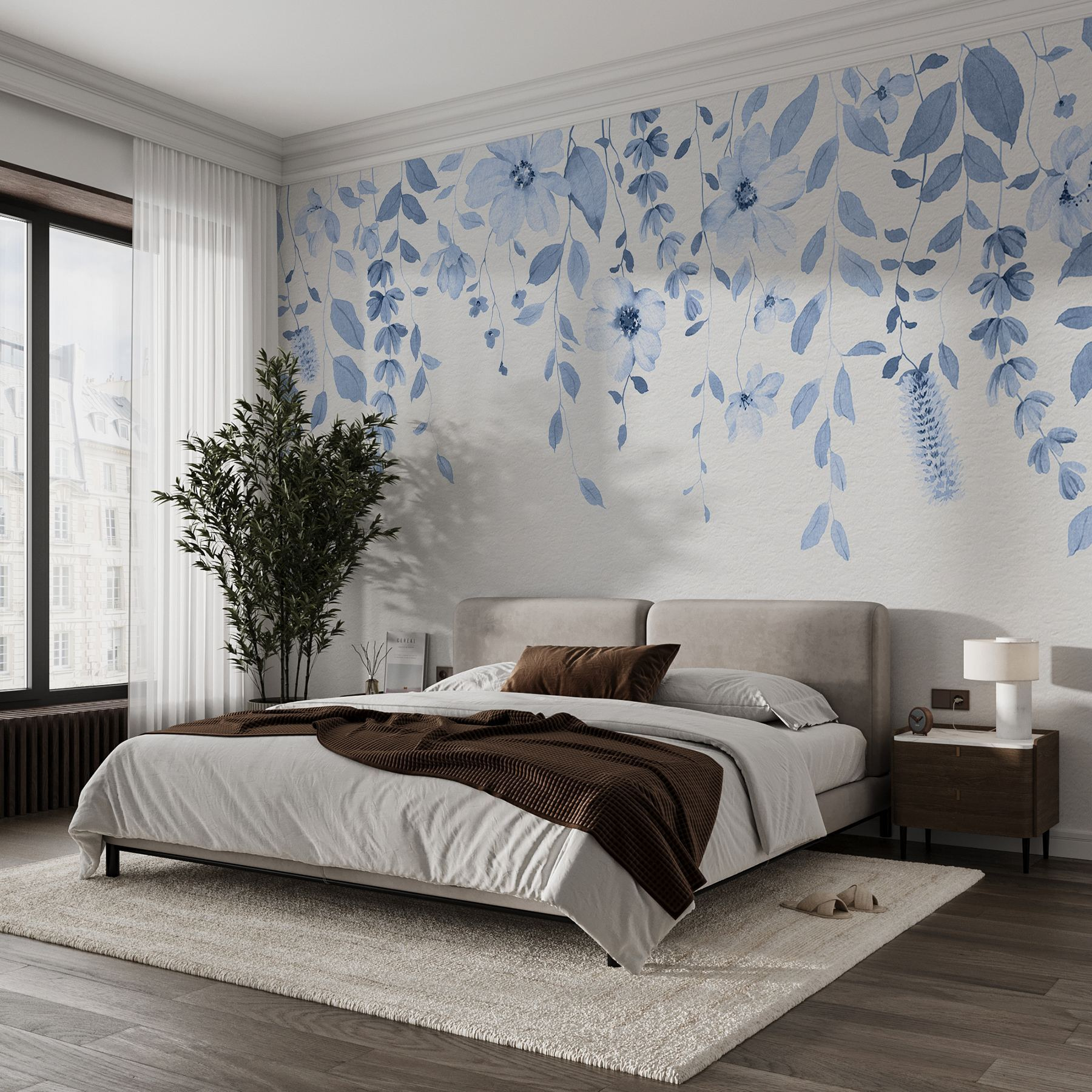 Transformeer elke ruimte met de serene charme van de “Fotobehang Blue Flowers and Leaves”. Stel je voor: een zachte, trapsgewijze weergave van delicate bloemen en bladeren, waar blauwe tinten samen dansen als een koele bries op een zonnige dag. Het is alsof je een vleugje natuur in je kamer brengt, zonder dat je je zorgen hoeft te maken over water geven!