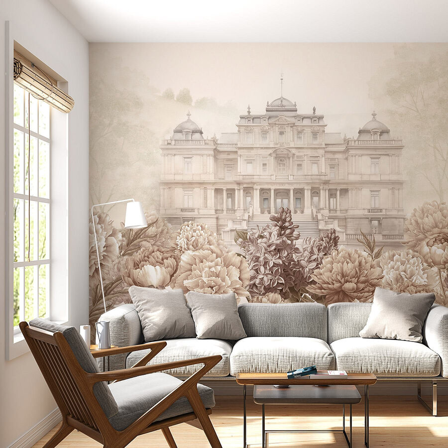 Breng een vleugje sereniteit in je kamer met deze prachtige muurschildering. De muurschildering bestaat uit een groot wit gebouw met delicate bloemen, waardoor een dromerige achtergrond ontstaat die zowel elegant als uitnodigend aanvoelt. Stel je eens voor dat je een kamer binnenloopt waar de charme van pioenrozen en seringen je onmiddellijk opfleurt. Het is net alsof je ontsnapt naar een rustige tuin telkens als je binnenstapt. Deze muurschildering is perfect voor een woonkamer of zelfs een gezellig leeshoekje, en straalt verfijning uit terwijl het toch warm en toegankelijk aanvoelt. Denk maar aan alle complimenten als vrienden deze schoonheid zien – over een gespreksstarter gesproken!