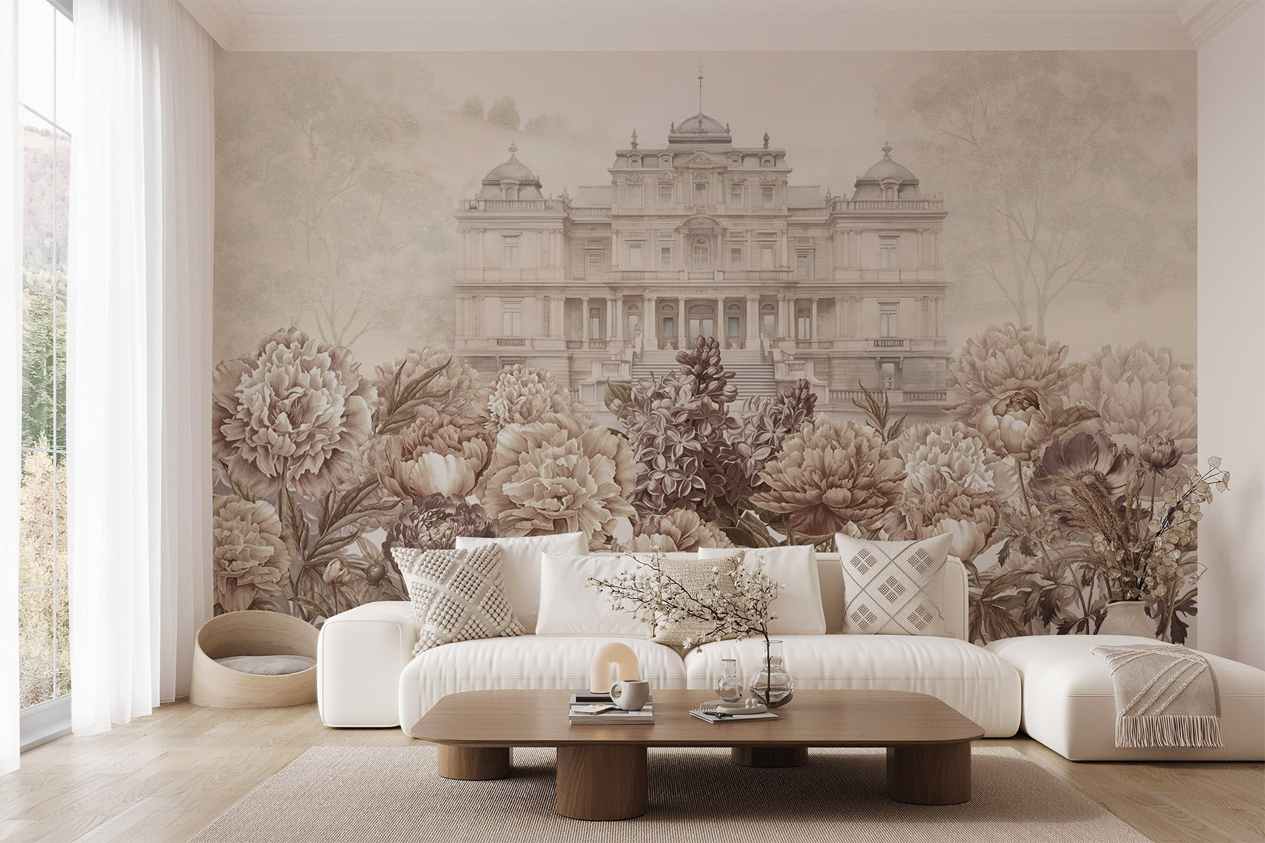 Breng een vleugje sereniteit in je kamer met deze prachtige muurschildering. De muurschildering bestaat uit een groot wit gebouw met delicate bloemen, waardoor een dromerige achtergrond ontstaat die zowel elegant als uitnodigend aanvoelt. Stel je eens voor dat je een kamer binnenloopt waar de charme van pioenrozen en seringen je onmiddellijk opfleurt. Het is net alsof je ontsnapt naar een rustige tuin telkens als je binnenstapt. Deze muurschildering is perfect voor een woonkamer of zelfs een gezellig leeshoekje, en straalt verfijning uit terwijl het toch warm en toegankelijk aanvoelt. Denk maar aan alle complimenten als vrienden deze schoonheid zien – over een gespreksstarter gesproken!