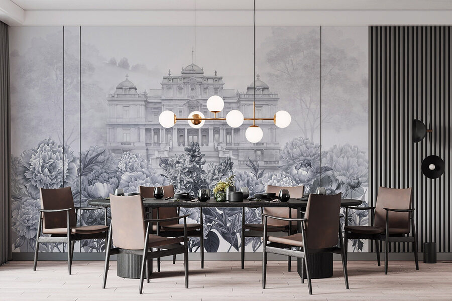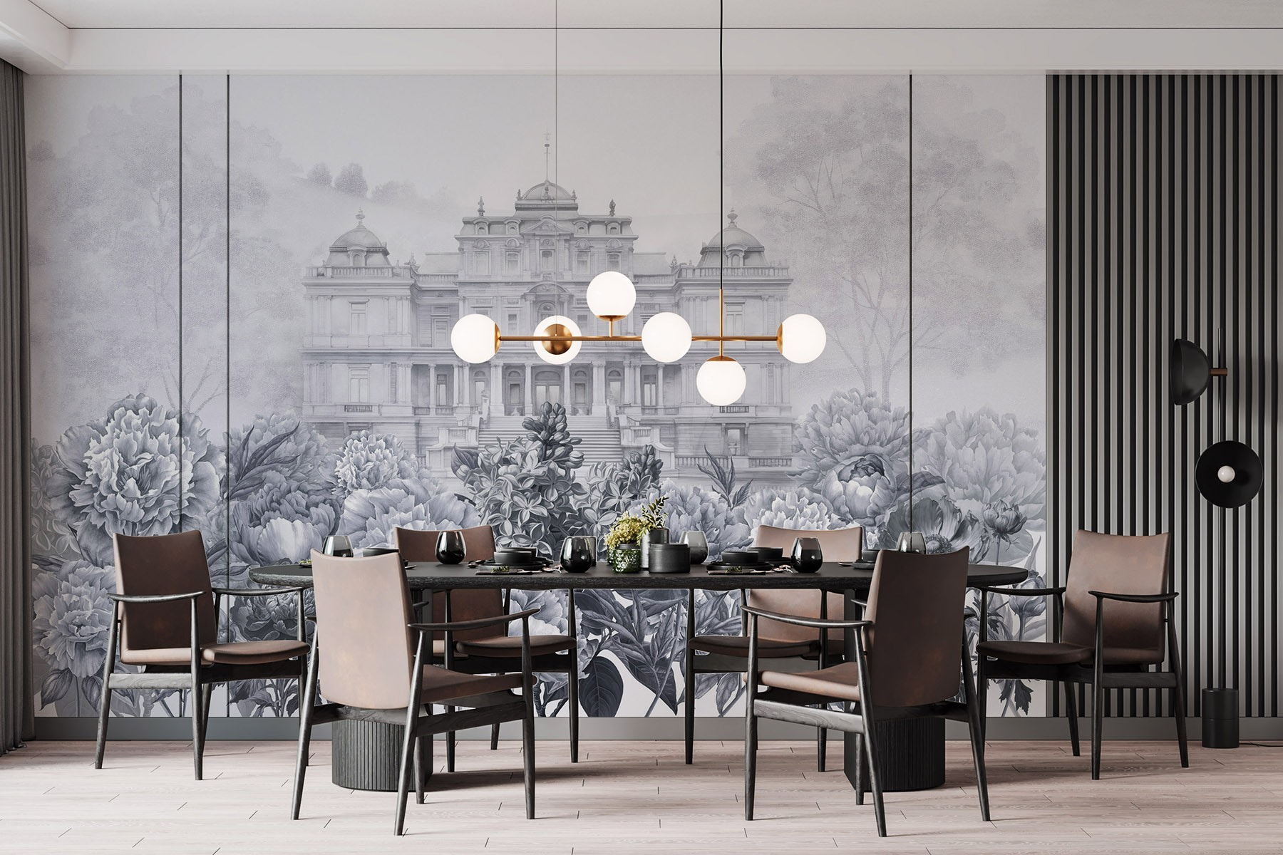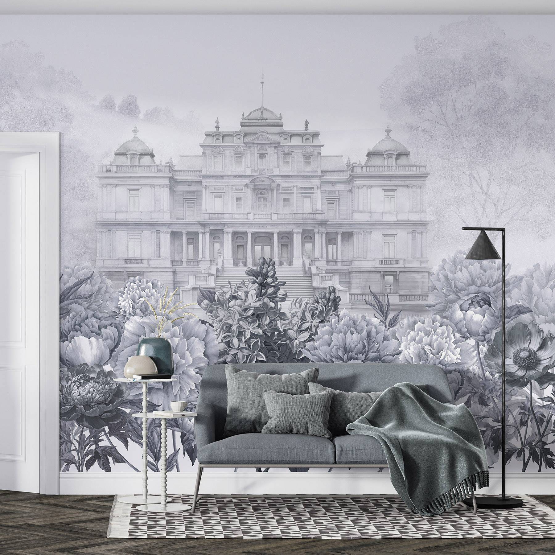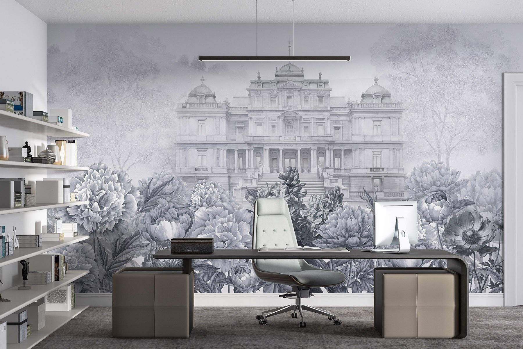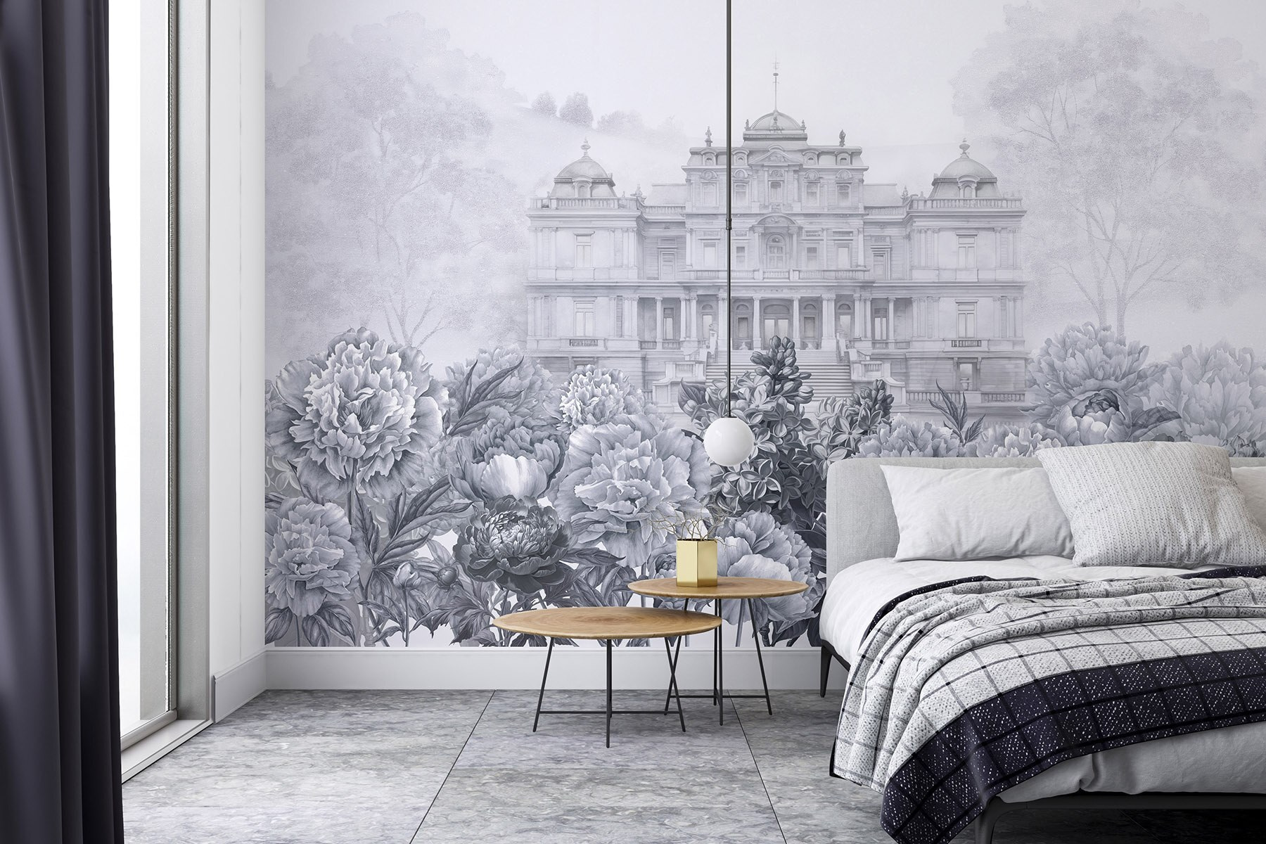 Stap in een wereld waar elegantie en natuur elkaar ontmoeten met deze prachtige muurschildering. Stel je een groots wit gebouw voor dat door een weelderige tuin met pioenrozen piept en uitnodigt tot dagdromen over thee in de namiddag op een zonovergoten terras. De zachte grijstinten creëren een rustgevende achtergrond, perfect om tot rust te komen na een lange dag. Vrienden zullen midden in een gesprek stoppen, gefascineerd door de unieke schoonheid. Het is alsof je een voorproefje van een Europees landgoed in je woonkamer haalt, maar dan zonder het fikse prijskaartje. Plaats deze schoonheid op een opvallende muur en zie je kamer opbloeien!