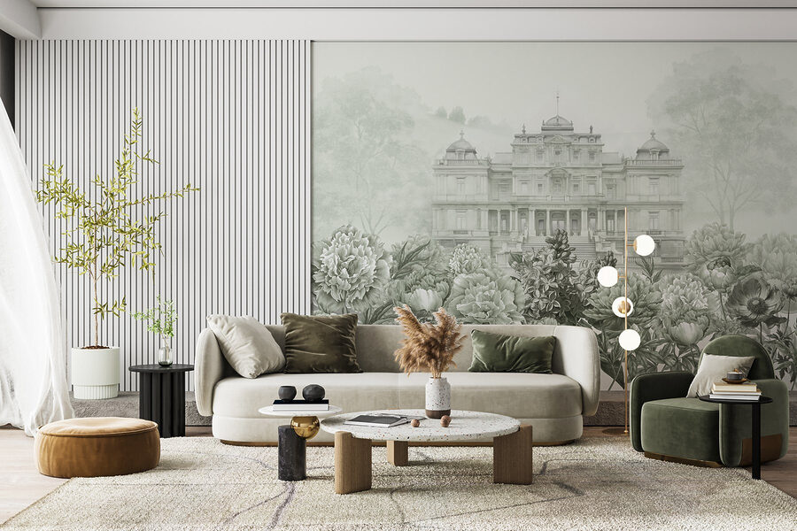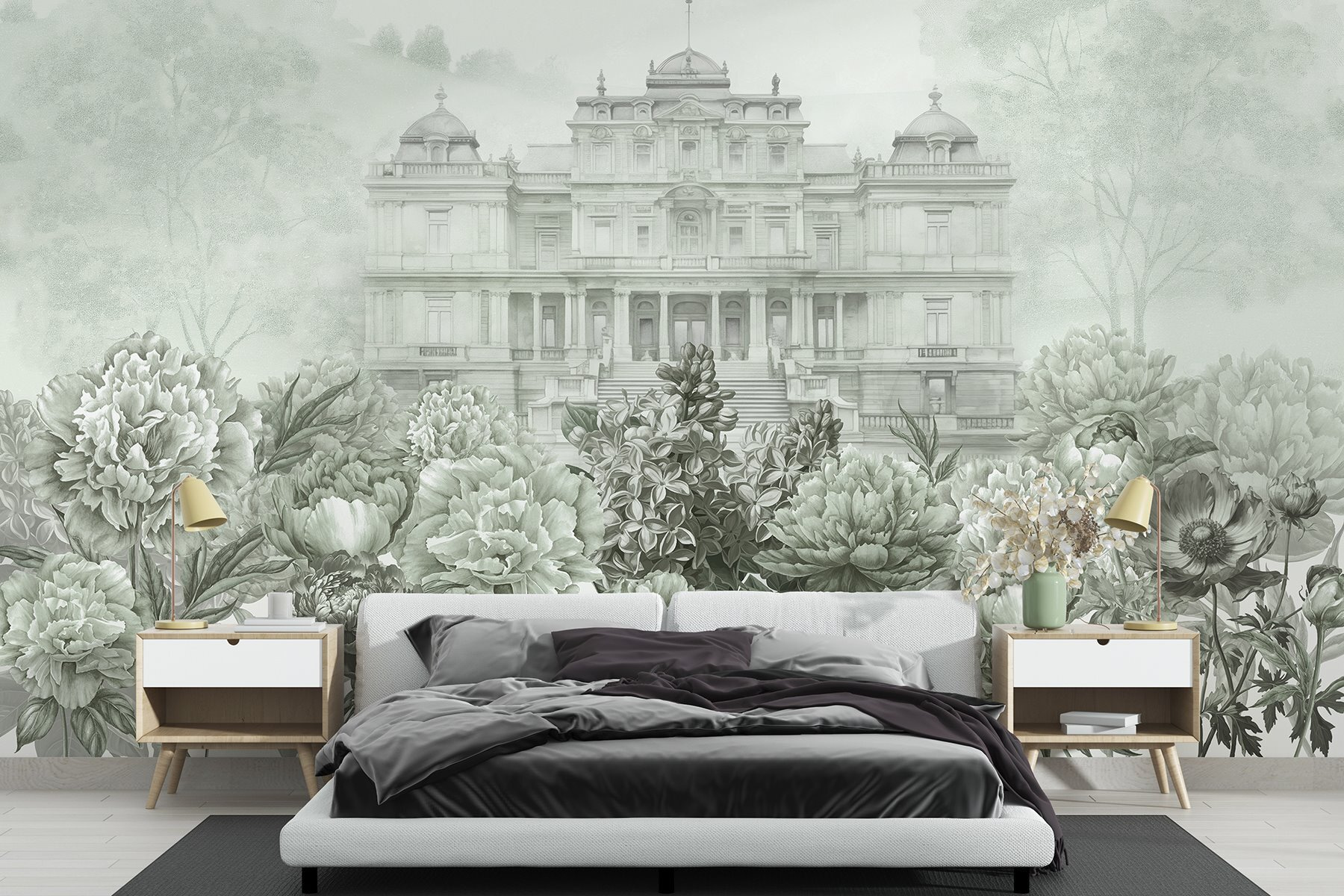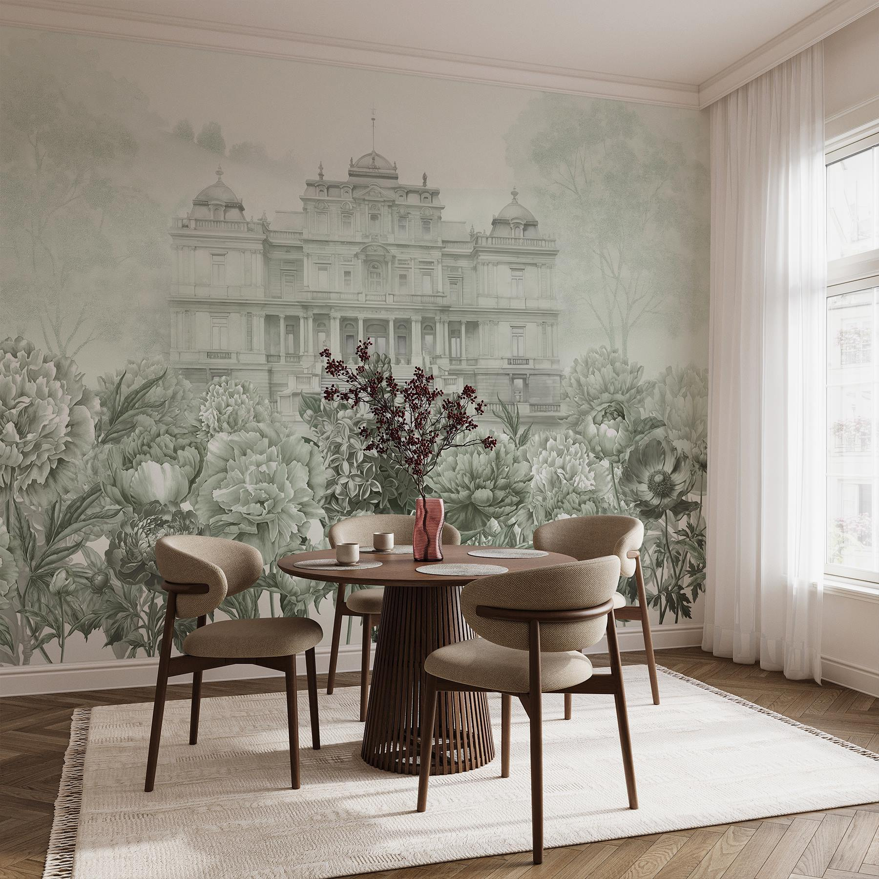 Transformeer elke ruimte met deze prachtige muurschildering met een groots wit gebouw en levendige bloemen. Stel je voor dat je een kamer binnenloopt en begroet wordt door een prachtige explosie van pioenrozen, terwijl de majestueuze achtergrond de aandacht trekt. Het is alsof je een stukje serene tuinmagie in huis haalt. Deze muurschildering is perfect voor mensen die houden van een beetje elegantie in combinatie met de charme van de natuur en kan een rustgevende toon zetten of vrolijke gesprekken op gang brengen. Stel je voor dat vrienden zich verwonderen over het detail terwijl ze thee drinken, of dat een gezellige filmavond een beetje specialer voelt. De perfecte finishing touch voor elk huis dat stijlvol in bloei staat.