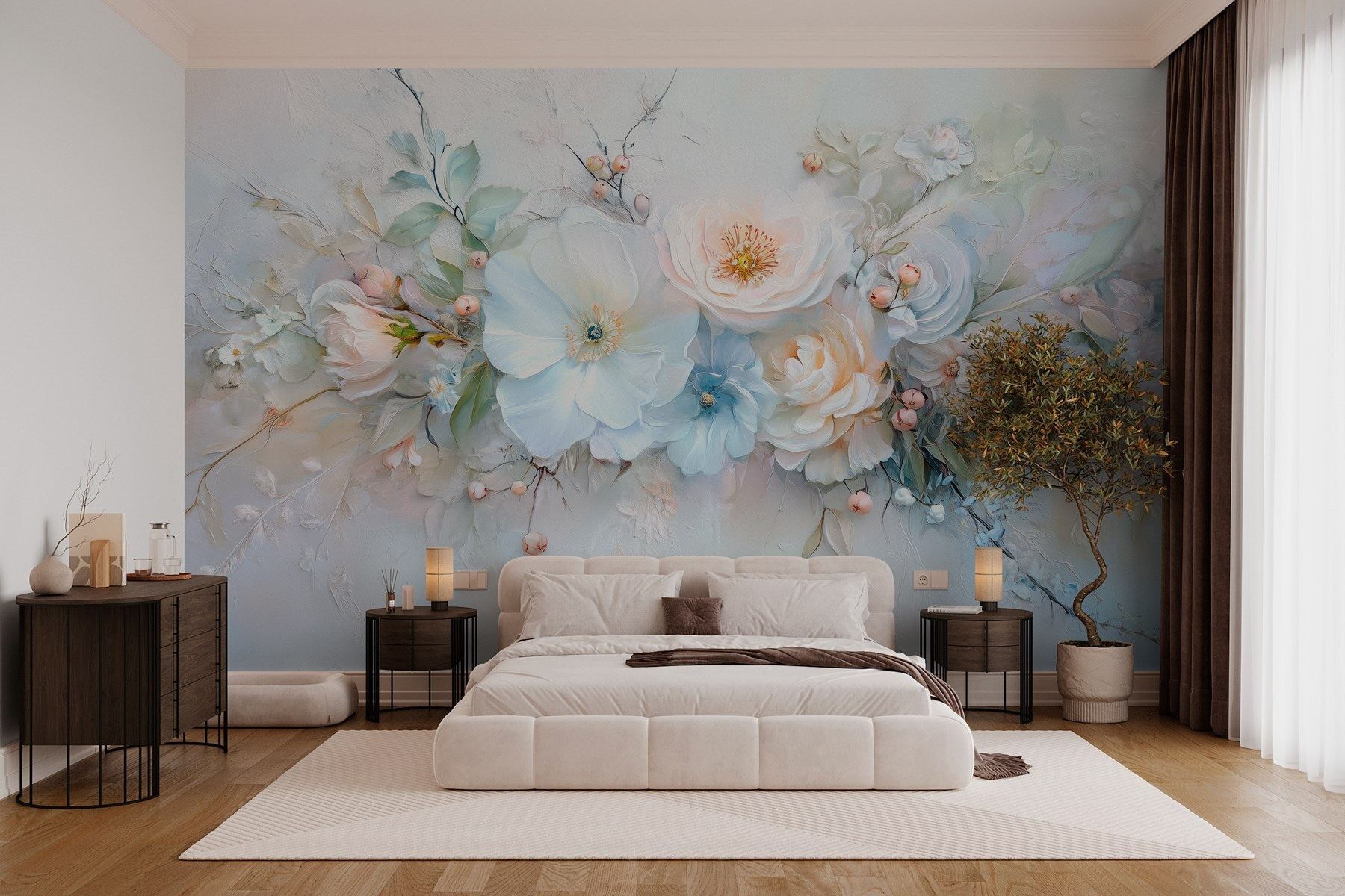 Transformeer elke kamer met deze prachtige bloemen muurschildering, met een betoverende mix van zachte bloemen en delicate bladeren. Stel je voor dat je de ruimte binnenloopt en je opgebeurd voelt door deze elegante bloemen, alsof ze zoete geheimen fluisteren vanuit een zonovergoten tuin. De zachte kleuren creëren een serene sfeer, perfect om tot rust te komen na een lange dag. Het is alsof je een stukje natuur in huis hebt om je aan te moedigen. Gasten vragen zich misschien af of je wel groene vingers hebt, maar in werkelijkheid is het allemaal te danken aan deze prachtige muurschildering. Een perfect accent voor knusse hoekjes of zelfs een stoer statement in een woonkamer.