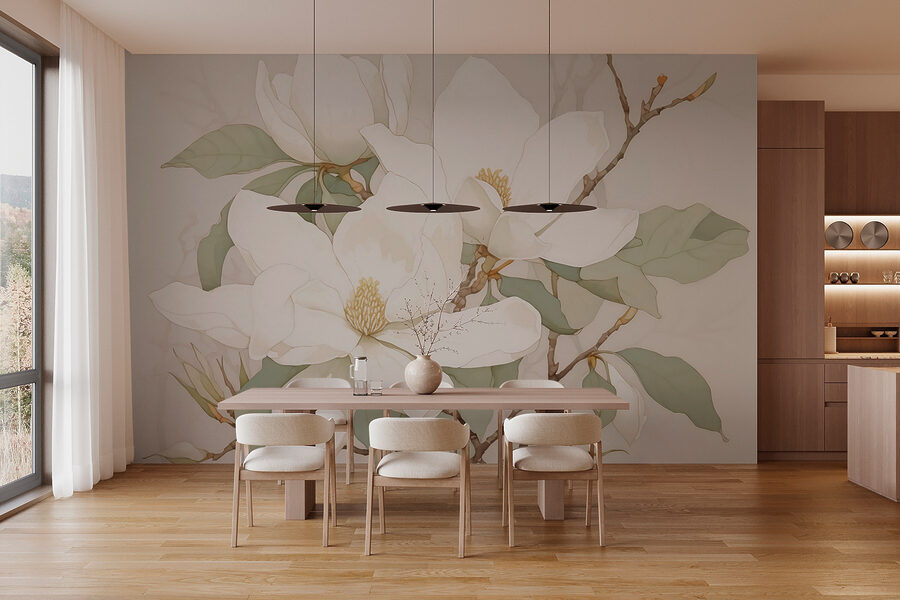 Transformeer elke kamer met deze prachtige muurschildering van witte bloemen. Stel je voor dat je de ruimte binnenloopt en begroet wordt door zachte, serene bloemen die bijna rust lijken te fluisteren. De tere bloemblaadjes en het zachte groen creëren een sfeer die zowel verfrissend als rustgevend is – perfect voor een gezellige leeshoek of een rustige slaapkamer.