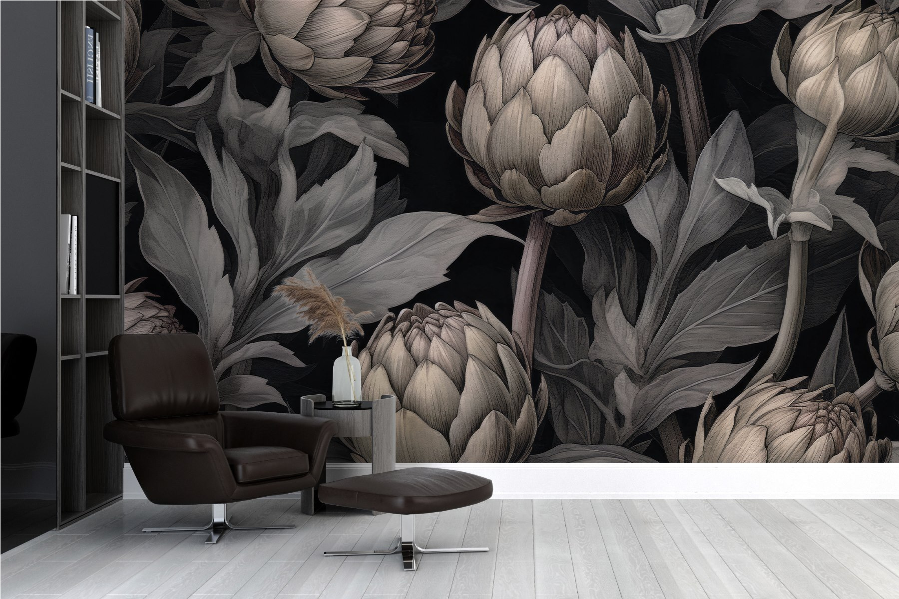 Transformeer je ruimte met deze prachtige muurschildering met artisjokken en bladeren die dansen tegen een chique zwarte achtergrond. Het is alsof je een stijlvolle tuinmuur hebt die elke kamer direct opfleurt. Stel je voor: vrienden die langskomen en plotseling steelt die muur de show – iedereen staart naar die prachtig gedetailleerde artisjokken, bijna alsof ze de aardsheid van een verse oogst kunnen ruiken. Het is verfijnd en toch gezellig, perfect voor een woonkamer of zelfs een keuken. Wie wist dat artisjokken zo’n charmante uitstraling konden hebben? Voeg een vleugje natuur toe aan je huis zonder het gedoe van onderhoud!