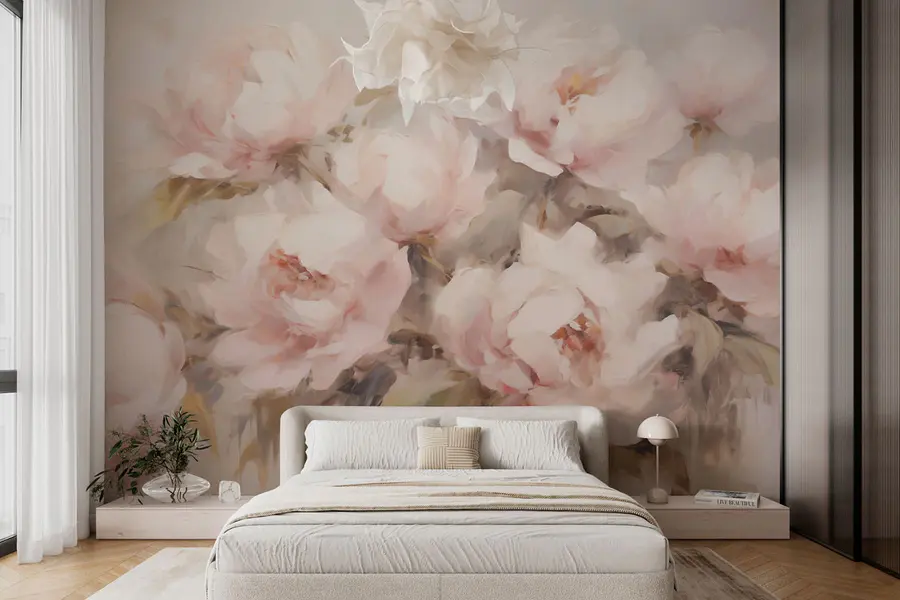 Fleur elke kamer op met deze prachtige muurschildering van zachtroze bloemen op een serene witte achtergrond. Stel je voor dat je elke dag wakker wordt met deze bloemenpracht – het is net alsof je een tuin binnenshuis hebt, zonder het vuil en de gieter. Perfect voor een gezellige woonkamer of een rustige slaapkamer, deze muurschildering voegt een vleugje elegantie en rust toe aan je ruimte. Of je nu vrienden ontvangt of gewoon geniet van een rustig moment, het zorgt voor een glimlach en complimenten. En wie houdt er niet van het idee dat pioenrozen een beetje extra vrolijkheid brengen? Het is net kunst van de natuur zelf, op je muur.