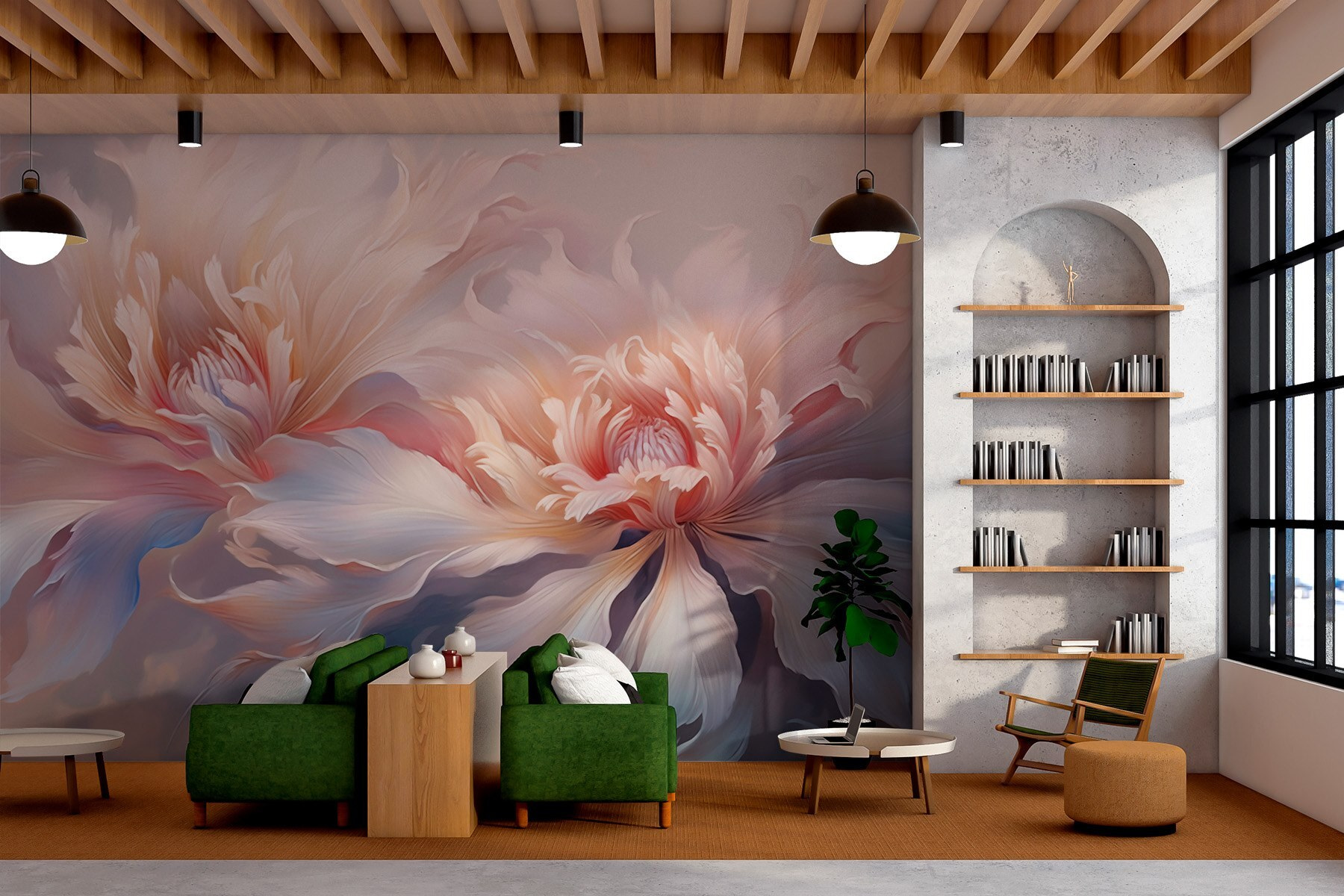 Stel je voor dat je een serene wereld binnenstapt vol tere bloesems, waar zachte tinten met de muren flirten. Deze muurschildering brengt een zacht gefluister van de natuur binnenshuis. Elk bloemblaadje lijkt te dansen en nodigt uit tot kalmte die zelfs de saaiste hoekjes kan opfleuren.