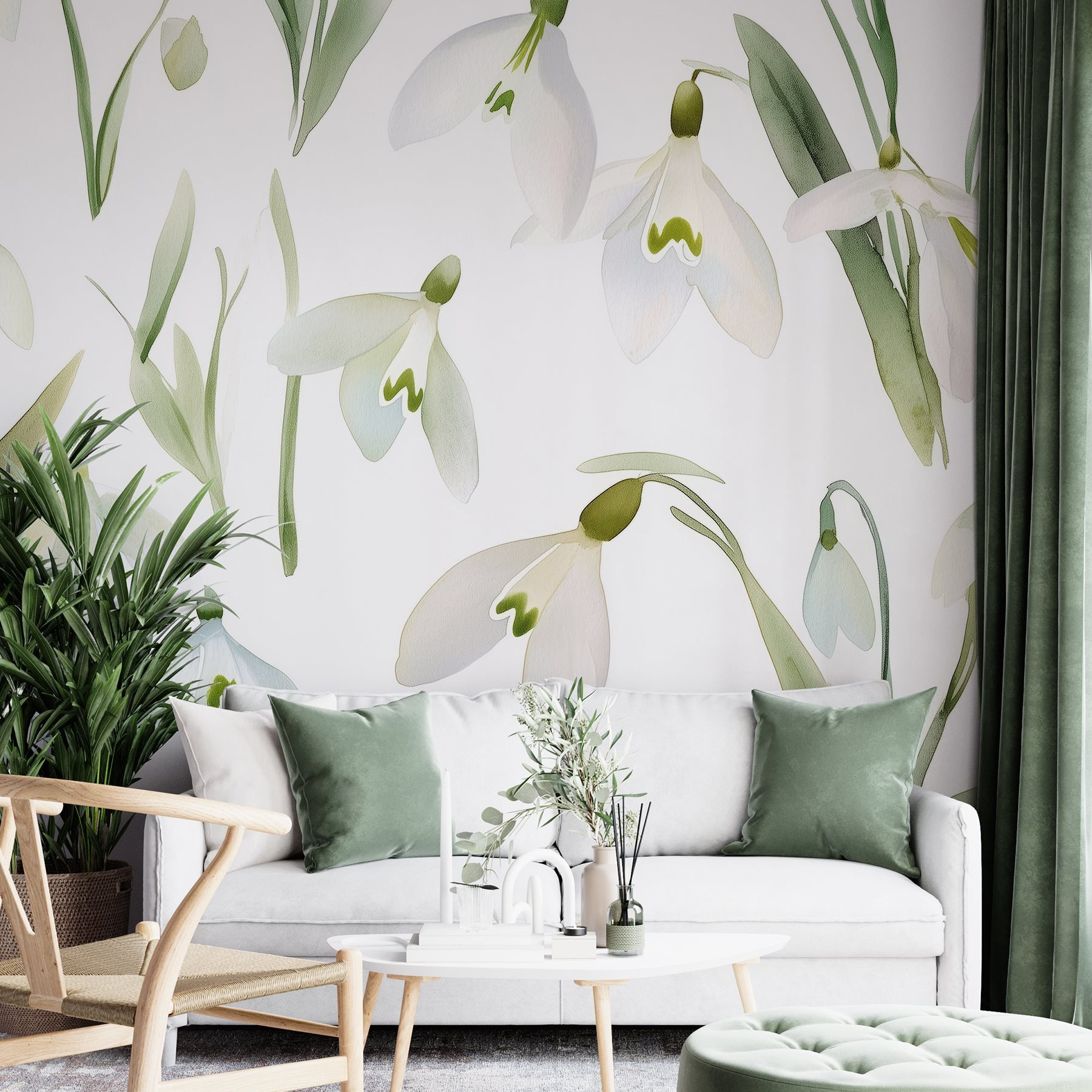 Transformeer elke kamer met deze charmante muurschildering met een prachtig patroon van witte bloemen. Stel je voor dat je een ruimte binnenloopt waar deze zoete bloemen een frisse wind laten waaien, een beetje zoals de lente die naar binnen sluipt wanneer je het het minst verwacht. Zacht groen en zacht wit dansen over de muur en creëren een vredige sfeer die aanvoelt als een gezellige tuin. Stel je voor dat je in de buurt thee drinkt en je rustig en geïnspireerd voelt terwijl je omringd bent door de schoonheid van de natuur. Het is alsof je een stukje sereniteit in huis haalt. Perfect om een woonkamer, slaapkamer of zelfs een creatief hoekje op te fleuren!