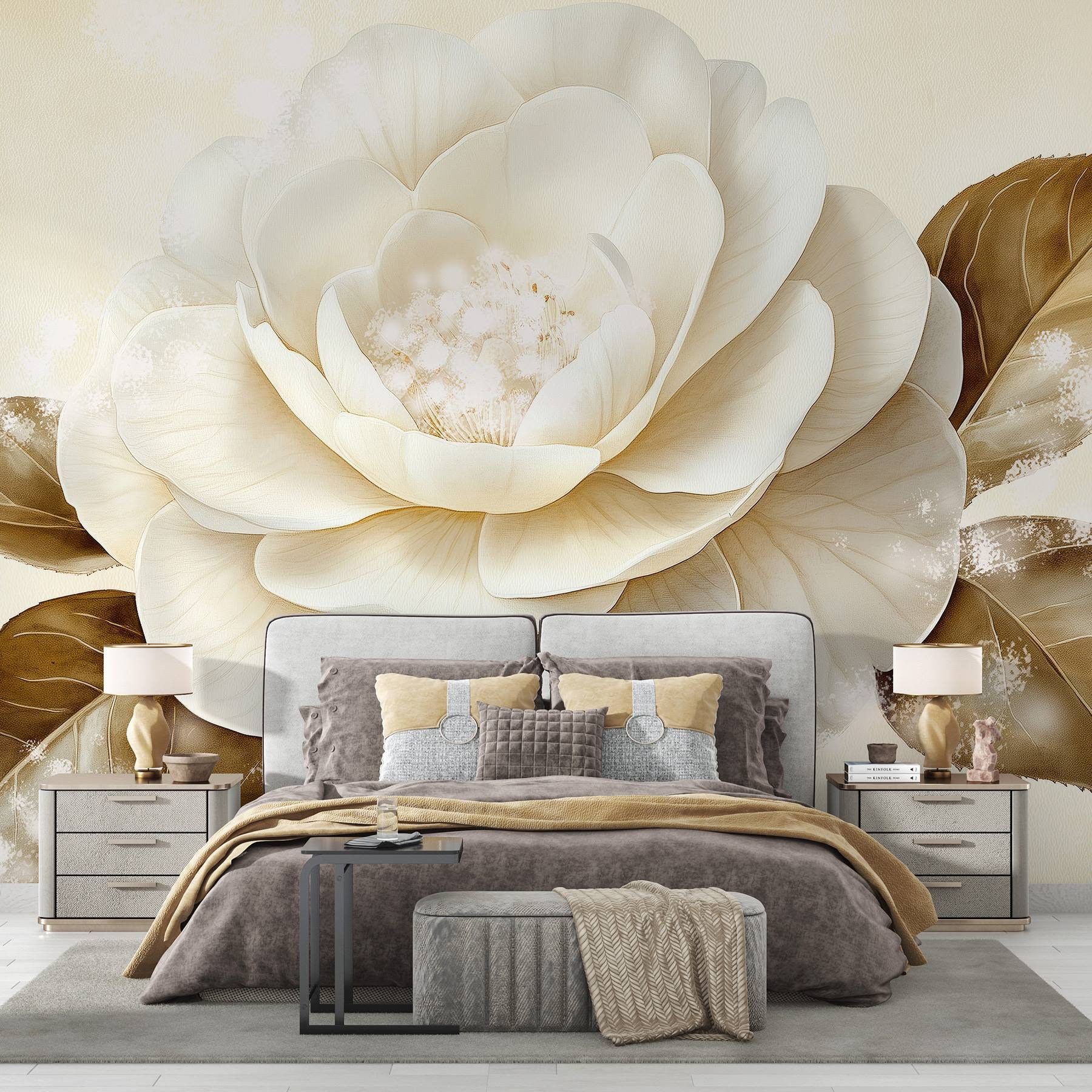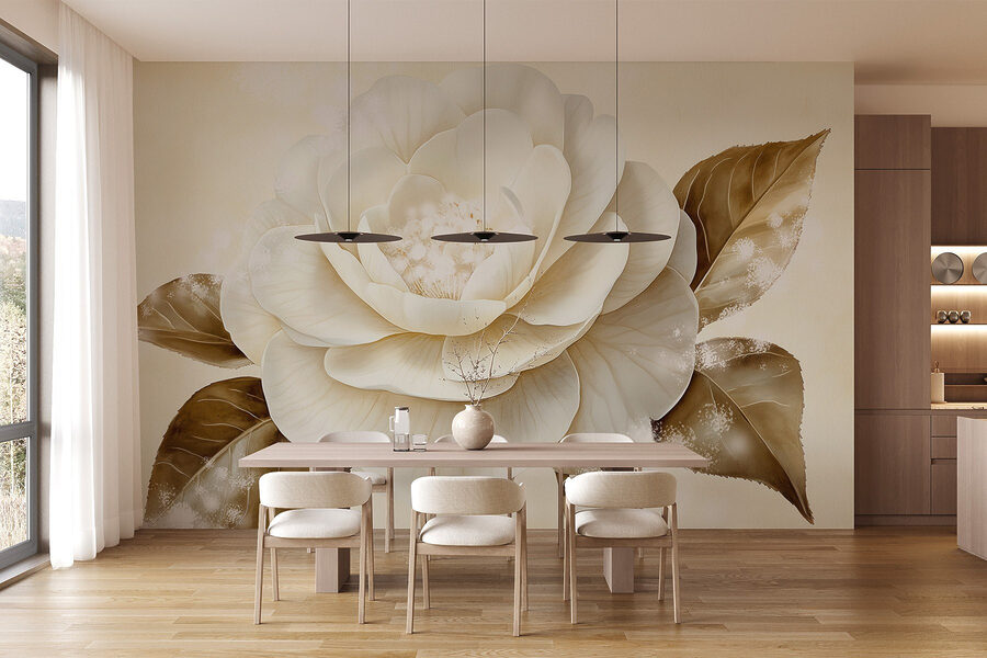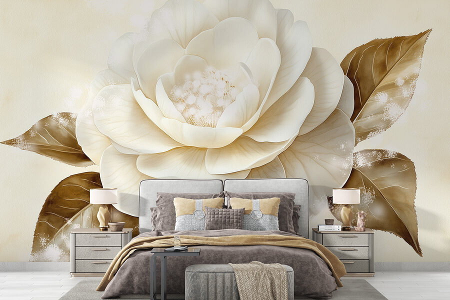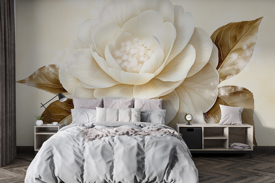 Transformeer je ruimte met deze prachtige muurschildering met een prachtige witte bloem en warme bruine bladeren. Stel je voor dat je een kamer binnenstapt waar dit kunstwerk je begroet en vult met een gevoel van rust en de charme van de natuur. De zachte tinten en delicate details trekken de aandacht, waardoor het perfect is voor een gezellige woonkamer of een serene slaapkamer. Bezoekers zullen misschien even stilstaan om de schoonheid te bewonderen en misschien zelfs geïnspireerd raken om te ontspannen met een goed boek in de buurt. Het is alsof je een beetje van het buitenleven naar binnen haalt, zonder de pollen. Een eenvoudige verandering die vreugde brengt, vind je niet?