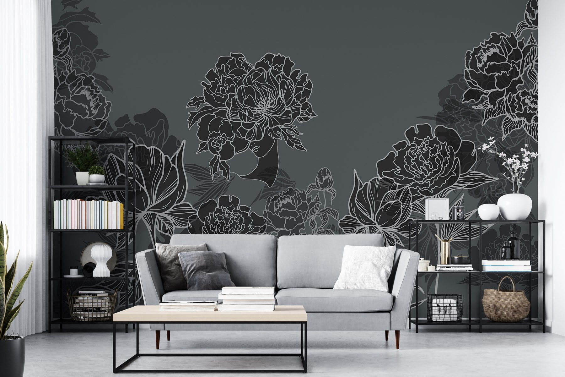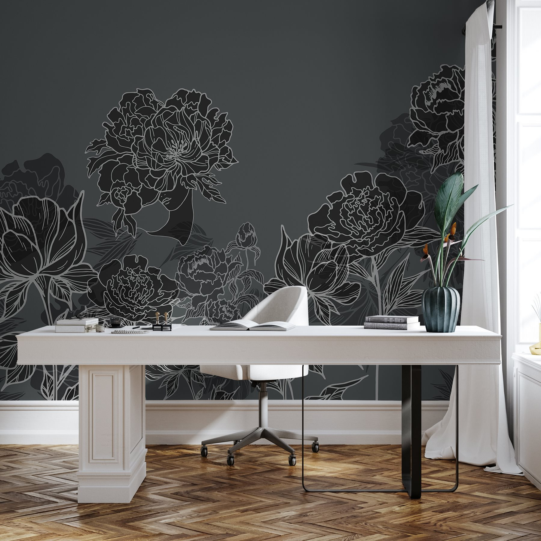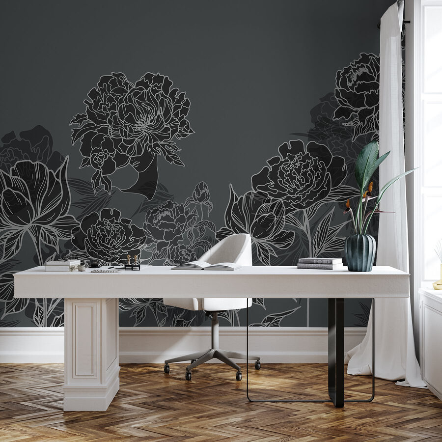 Tover je ruimte om in een botanisch wonderland met deze prachtige muurschildering met een levendige groep bloemen op een strakke grijze achtergrond. Het is alsof je een stukje geheime tuin in je woonkamer hebt. Stel je voor dat je wegzakt in je bank, een goed boek in de hand, terwijl de bloemen verhalen van de lente lijken te fluisteren. De zachte lijnen en schaduwrijke details creëren een visuele dans die zowel rustgevend als verkwikkend is – perfect voor een knus hoekje of een opvallende muur. Bovendien is het een gespreksstarter zonder een woord te zeggen. Wie wil er nou niet praten over de charme van de natuur? Breng leven en persoonlijkheid aan je muren; het is een briljant idee!