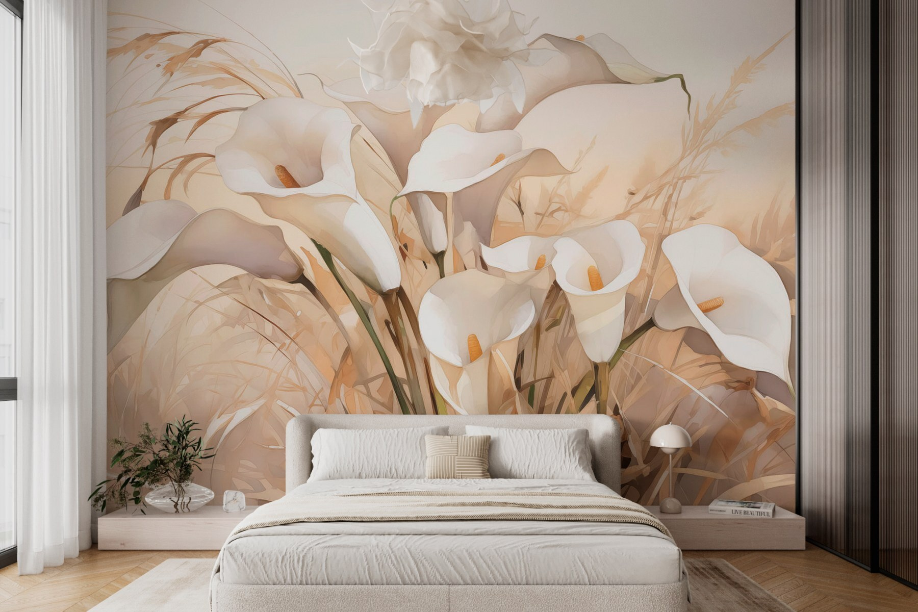Transformeer je ruimte met deze prachtige muurschildering met een groep elegante witte bloemen. Stel je voor dat je een serene tuin binnenstapt, waar deze bloemen een vleugje natuur in je huis brengen. De zachte kleuren en zachte rondingen van elk bloemblaadje creëren een sfeer van rust en ontspanning. Het is alsof je een mini-heiligdom aan je muur hebt! Vrienden zullen langskomen en misschien raak je wel aan de praat over hoe de bloemen de buitenlucht naar binnen lijken te brengen. Perfect voor een gezellige woonkamer of een rustige slaapkamer, deze muurschildering fluistert schoonheid en vrede.