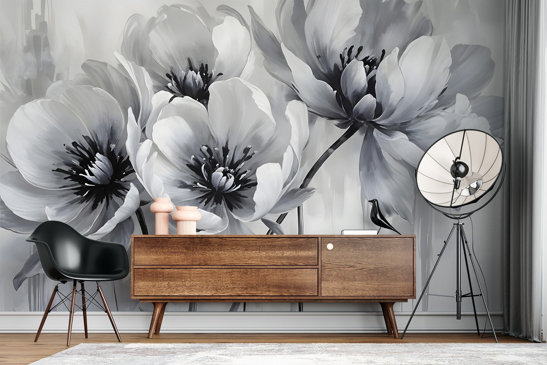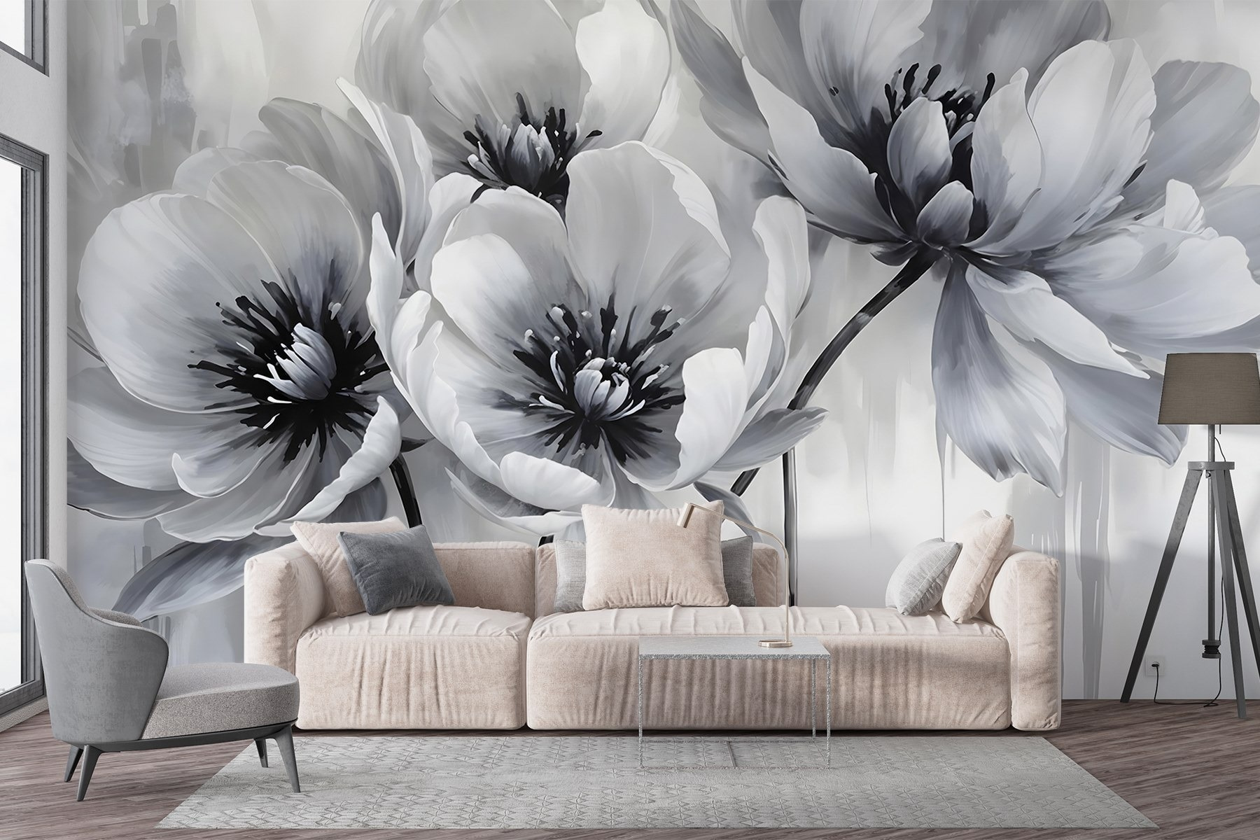 Transformeer je kamer met deze prachtige muurschildering met een sierlijke groep bloemen op een zacht witte achtergrond. Stel je voor dat je een kamer binnenloopt die aanvoelt als een serene tuinoase – hier heb je geen groene vingers voor nodig! Deze pioenrozen en rozen in chique monochroom brengen een vleugje elegantie zonder de zintuigen te overweldigen. Perfect voor woonkamers, slaapkamers of zelfs die gezellige leeshoek, ze nodigen gewoon uit tot ontspanning. De zachte penseelstreken en delicate details laten iedereen even stilstaan en bewonderen. Waarom niet een vleugje frisheid aan je muren toevoegen? Misschien ga je wel dagdromen onder het genot van een kopje koffie, of misschien plan je wel een soirée met bloemen als thema voor vrienden. Het is alsof je een tuin hebt die nooit verwelkt!