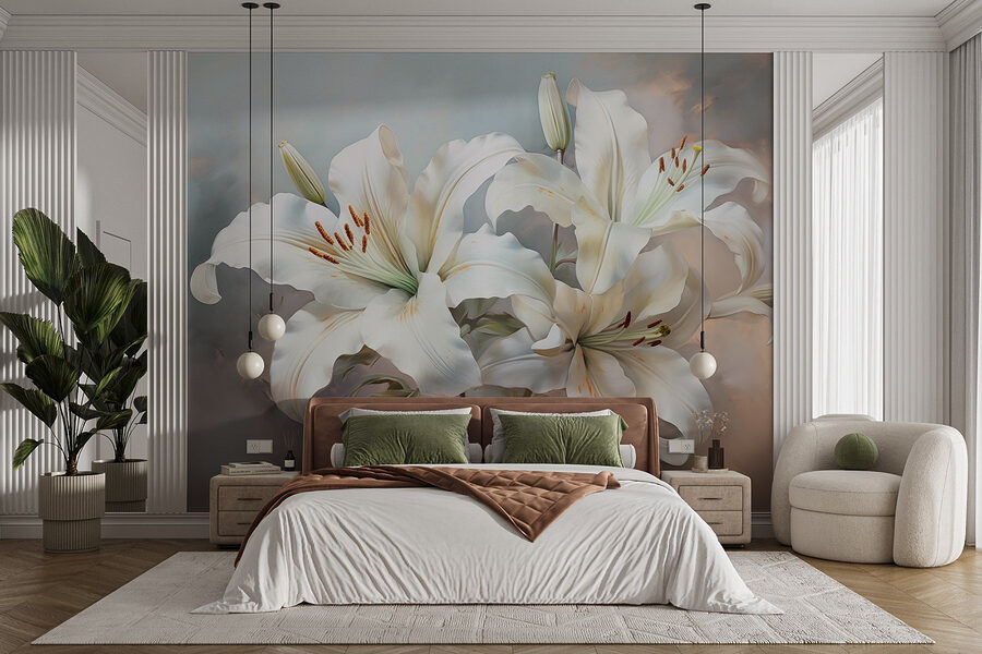 Tover je ruimte om in een sereen toevluchtsoord met de muurschildering “Delicate Lilies in Soft Hues”. Stel je voor dat je een kamer binnenstapt waar zachte, vloeiende lelies je begroeten en elegantie uitstralen. De zachte kleuren zijn als een gezellige omhelzing, perfect om dat hoekje op te fleuren waar je ‘s ochtends aan je koffie nipt of tot rust komt na een lange dag. Iedereen houdt van een goed bloemenverhaal en deze lelies inspireren misschien wel tot dagdromen over lentepicknicks en luie middagen. Voeg deze muurschildering toe en zie hoe de sfeer verandert – de kamer voelt lichter en meer uitnodigend. Het is alsof je een tuin hebt die nooit verwelkt.