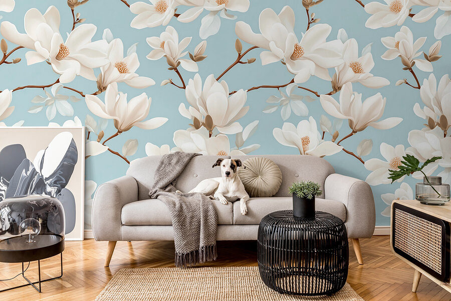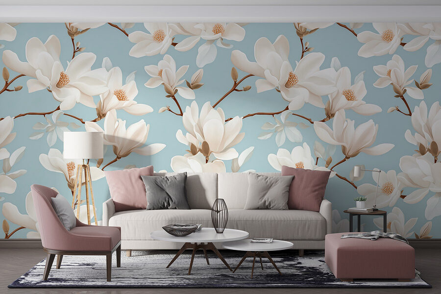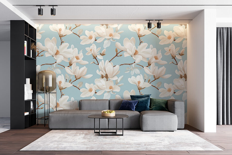 Transformeer uw ruimte met de prachtige ‘Wall Murals Pattern of White Flowers’. Stel u voor dat u een kamer binnenstapt waar sierlijke magnolia’s bloeien tegen een rustgevende hemelsblauwe achtergrond. Het is alsof u het hele jaar door lente in huis heeft! De delicate bloemblaadjes en zachte kleuren creëren een rustgevende sfeer – perfect om te ontspannen na een lange dag of om lekker weg te kruipen met een goed boek. Vrienden zullen binnenkomen en denken dat je je hebt teruggetrokken in een weelderige tuin! Bovendien herinnert het je eraan dat schoonheid slechts een muur verwijderd kan zijn. Wie had gedacht dat woninginrichting zo verfrissend en vrolijk kon zijn?