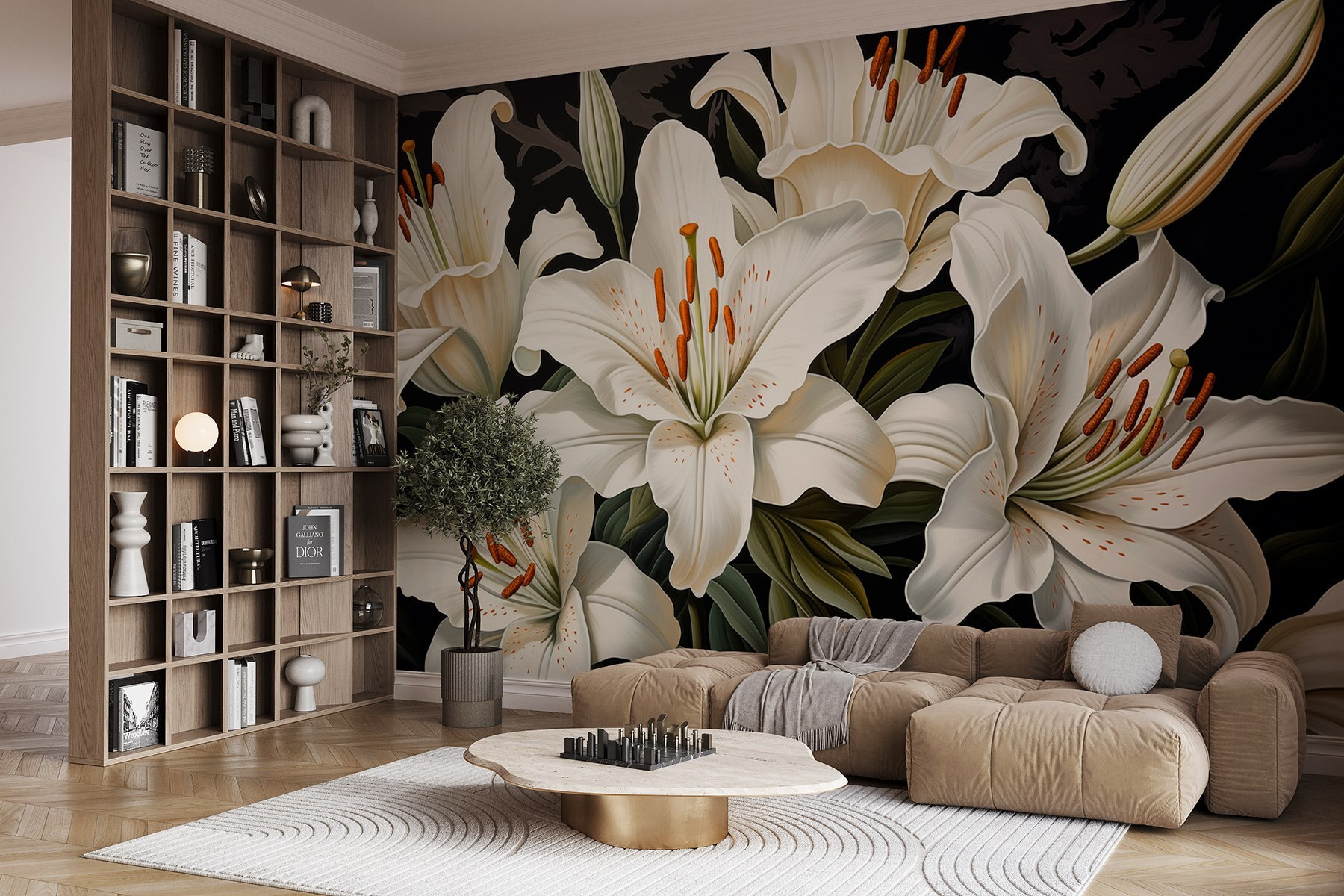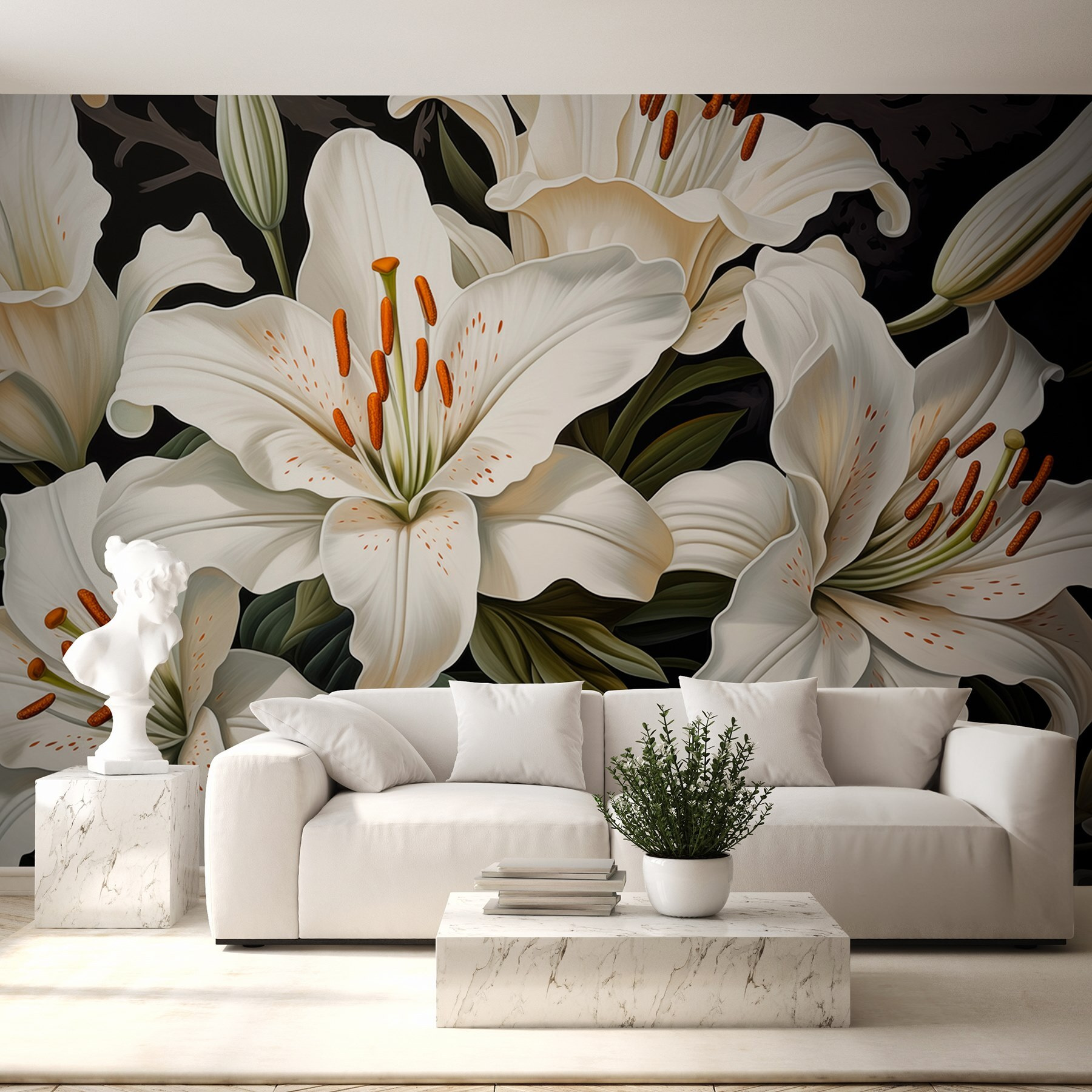 Tover elke ruimte om in een serene oase met deze prachtige muurschildering met prachtige witte lelies in volle bloei. Stel je voor dat je een kamer binnenloopt en je je meteen lichter voelt, alsof er net een frisse tuinbries is binnengestroomd. De tere bloemblaadjes en levendige details creëren een gevoel van rust, perfect voor een gezellige leeshoek of zelfs die muur die gewoon wat liefde nodig heeft. Het is alsof je de natuur in huis haalt zonder het gedoe van water geven! En wie zou er niet glimlachen als hij elke dag begroet wordt door zulke elegante bloesems? Geef die kale muren een bloemenknuffel!