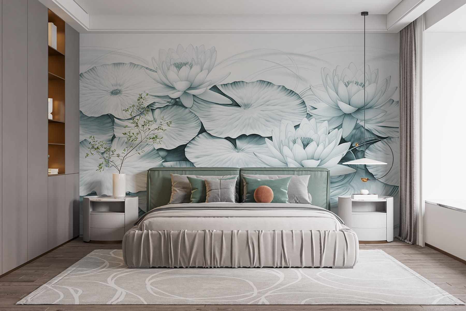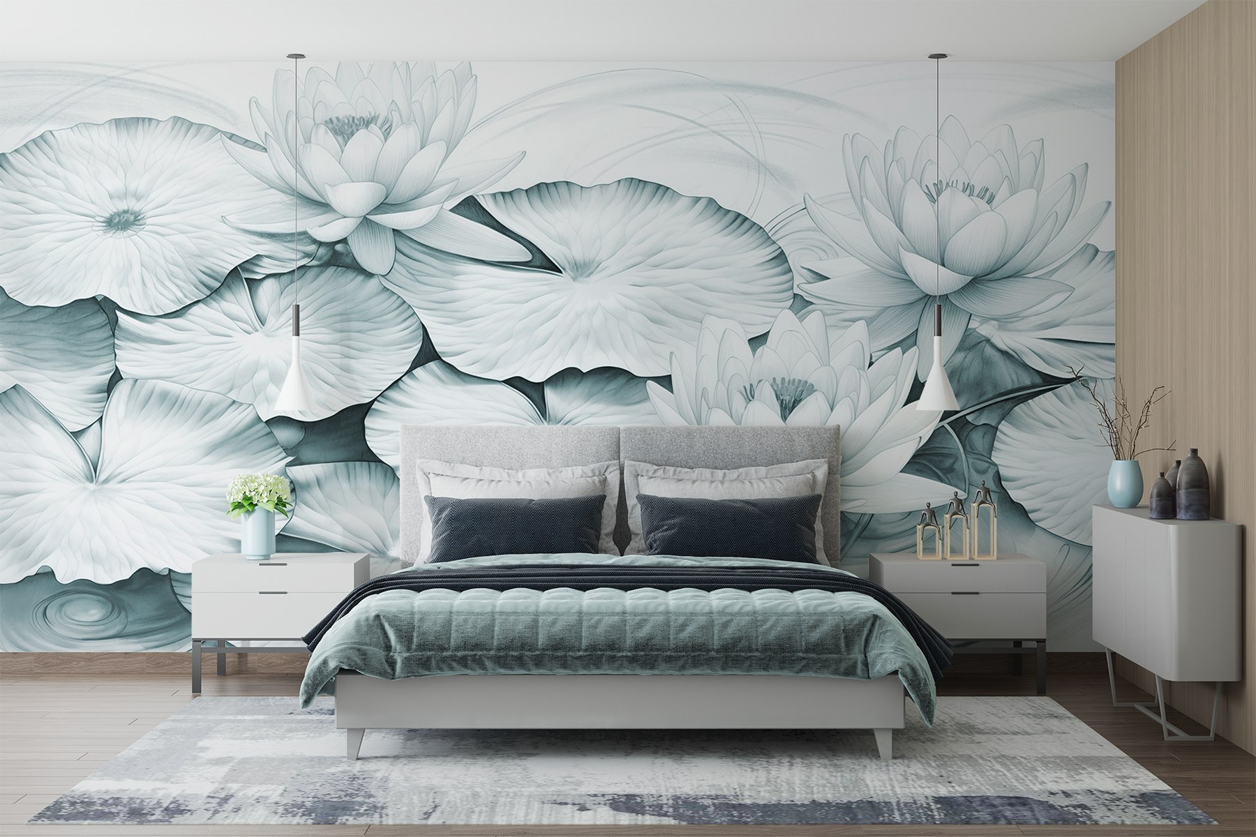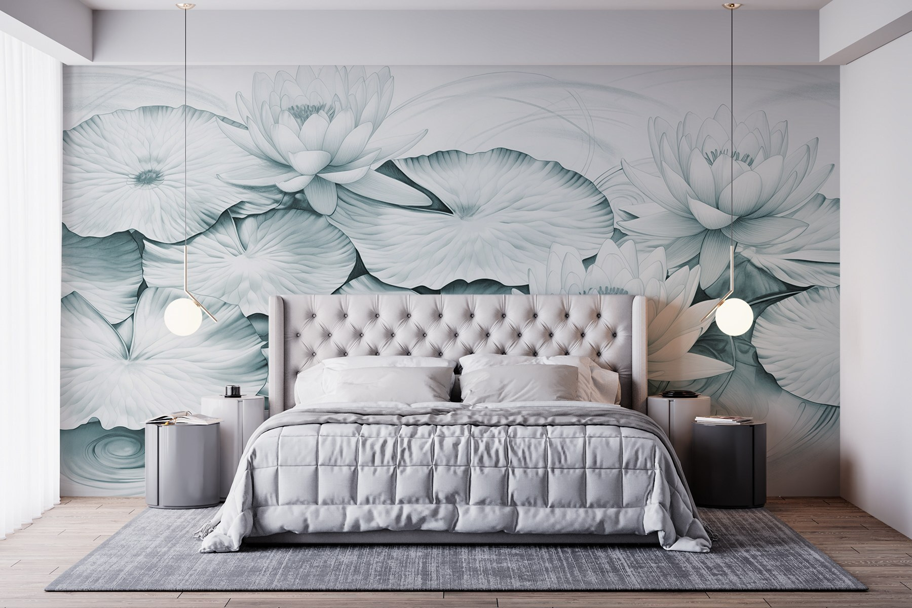 Transformeer je kamer met de serene schoonheid van deze muurschildering met een mooie groep leliebladzijden en delicate bladeren. Het is alsof je een vredige vijver in je kamer hebt – perfect om bij weg te dromen of gewoon te genieten van een rustig moment. Stel je voor dat je wegzakt in je favoriete stoel met een warm kopje thee in de hand, terwijl de zachte groene en witte kleuren je omringen als een zachte knuffel. Deze muurschildering is ideaal om gesprekken op gang te brengen, of het nu over de natuur gaat of over je laatste boekobsessie. Het is gemakkelijk en toch boeiend, net als een luie middag aan het water.