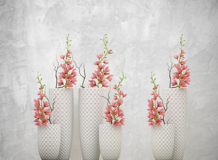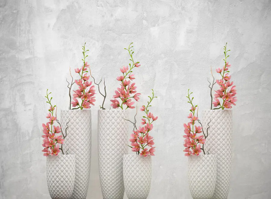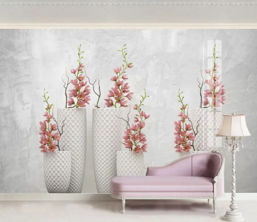 Transformeer uw ruimte met deze prachtige muurschildering met een charmante groep witte vazen versierd met roze bloemen. Het is alsof u een mini-Japanse tuin in uw woonkamer heeft, maar dan zonder dat u iets water hoeft te geven! Stel u voor dat u na een lange dag thuiskomt, op uw bank neerploft en wordt begroet door deze prachtige bloemen. De zachte kleuren en delicate details geven een gevoel van rust, als een zacht briesje op een lentedag. Perfect om een gezellig hoekje te creëren of een saaie hoek op te fleuren. Wie had gedacht dat decoratie zo speels kon zijn?