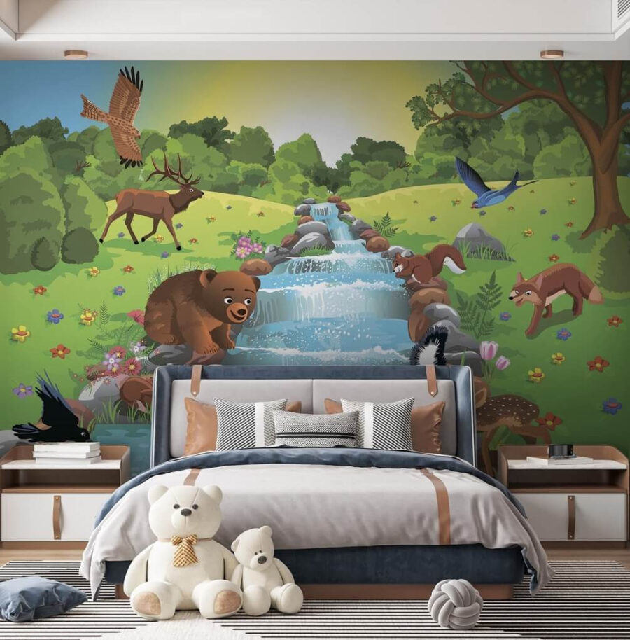 Verander uw ruimte in een levendig bos met deze charmante muurschildering met eigenzinnige dierenvrienden die genieten van een zonnige dag bij een sprankelende beek. Stelt u zich eens voor: een beer die in het water spettert, een nieuwsgierig hert dat zich buigt om te drinken en een brutale eekhoorn die zijn volgende snack beraamt. Deze muurschildering straalt vreugde en warmte uit en is perfect voor familiekamers of speelruimtes – het is alsof u een mini-avontuur in de natuur beleeft, gewoon bij u thuis! Elke blik herinnert u aan eenvoudigere tijden, frisse lucht en misschien krijgt u zelfs zin om de natuur in te trekken. Omarm de charme van de natuur en laat uw muren een verhaal vertellen!
