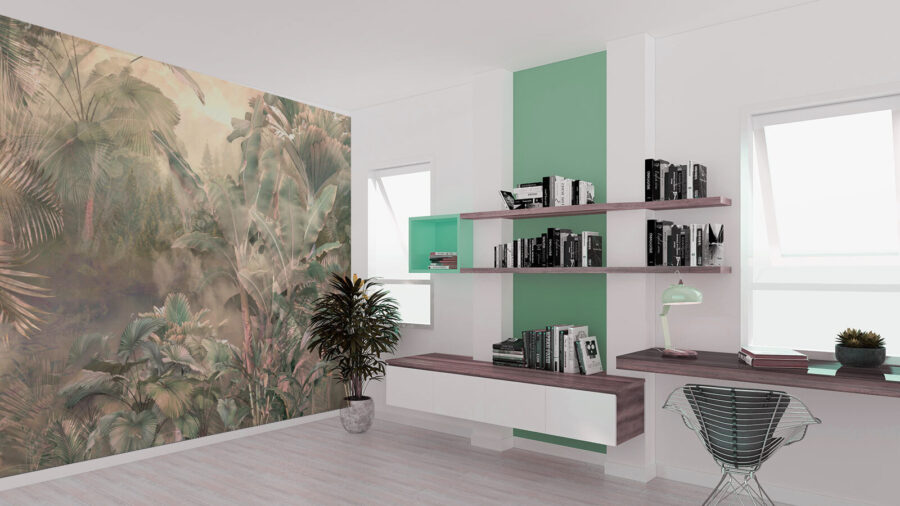 Verander elke kamer in een serene toevluchtsoord met de muurschildering ‘Foggy Forest with Trees and Plants’. Stel je voor dat je een mistige jungle binnenstapt, waar zachte groentinten en het gefluister van de natuur samenkomen. De zachte charme van deze muurschildering nodigt uit tot rust – perfect voor gezellige ruimtes of zelfs dat drukke kantoor dat wel een moment van zen kan gebruiken. Het weelderige gebladerte wiegt bijna in de wind, voel je het? Stel je die luie middagen voor, nippend aan een kopje thee terwijl je doet alsof je in een regenwoud ligt te luieren. Een vleugje natuurschoon komt bij je thuis, en laten we eerlijk zijn: wie wil dat nou niet? Voeg een paar potplanten toe en voilà: instant jungle-vibes!