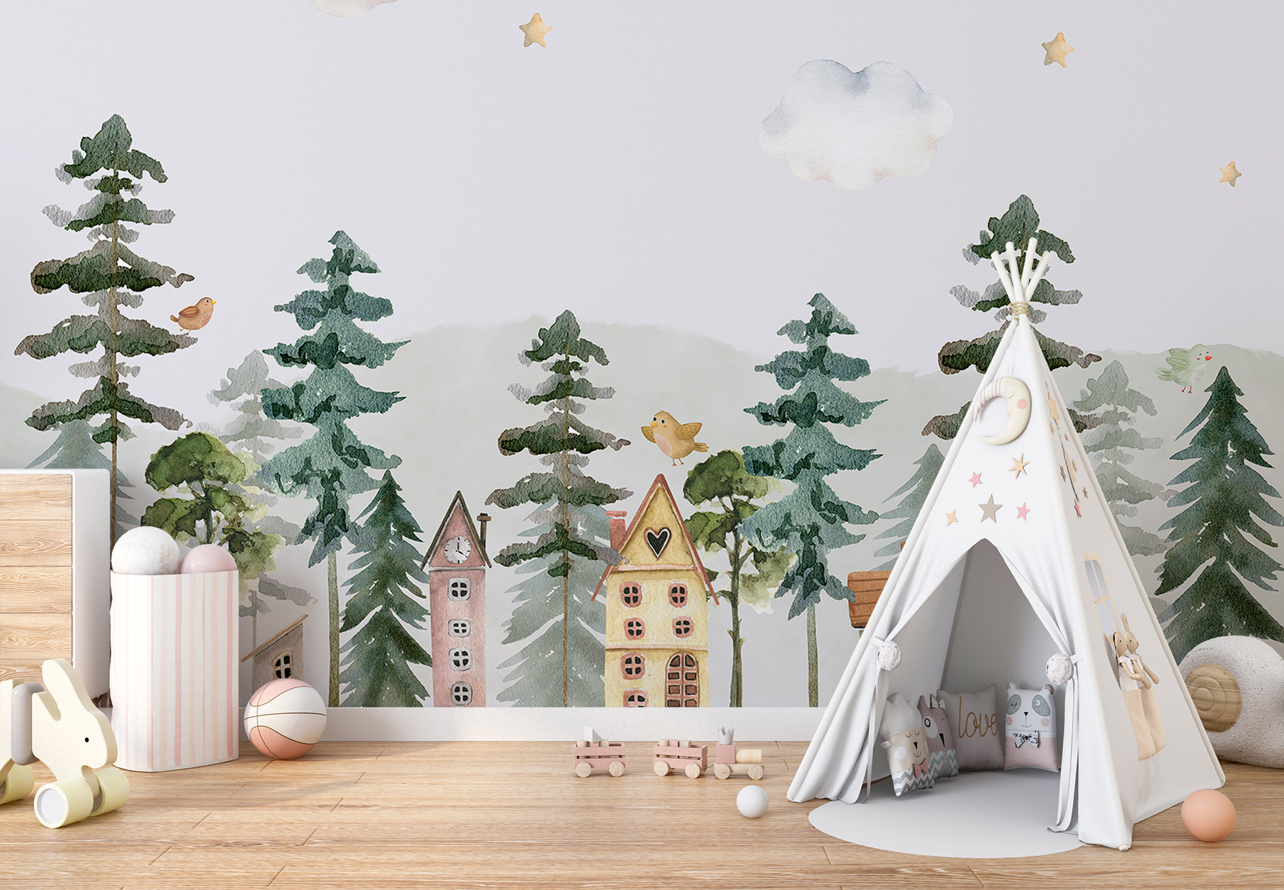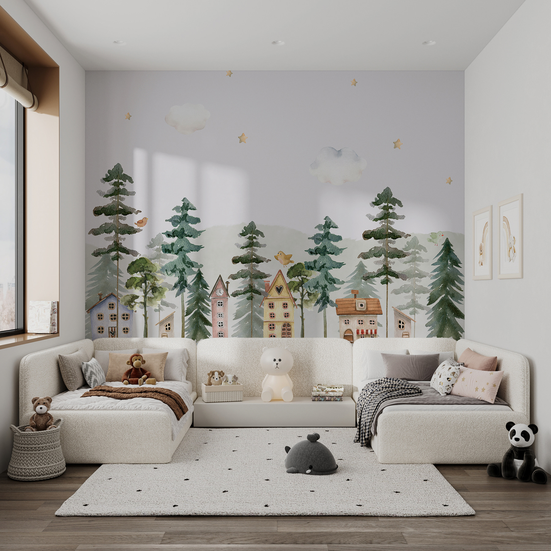 Oh, de charme van aquarel en de warmte van een gezellig huis! Deze “Fotobehang Watercolor of a House” verandert elke ruimte in een handomdraai in een grillig oase. Stel je voor dat je een kamer binnenloopt waar kleine geschilderde huisjes te midden van weelderige bomen tevoorschijn komen, met zachte wolken en sterren die erboven zweven – het is een kleine verhalenboekwereld aan je muur! Het is perfect voor kinderkamers en geeft een rustgevende, dromerige sfeer. De ingewikkelde details, zoals de hartvormige ramen en de vogels op de bomen, nodigen uit tot eindeloos fantasierijk spel. Zelfs op een onrustige nacht is het als een zachte herinnering aan kalmte en magie. Een lust voor het oog en vol karakter – deze muurschildering voelt aan als een oude vriend in je huis.
