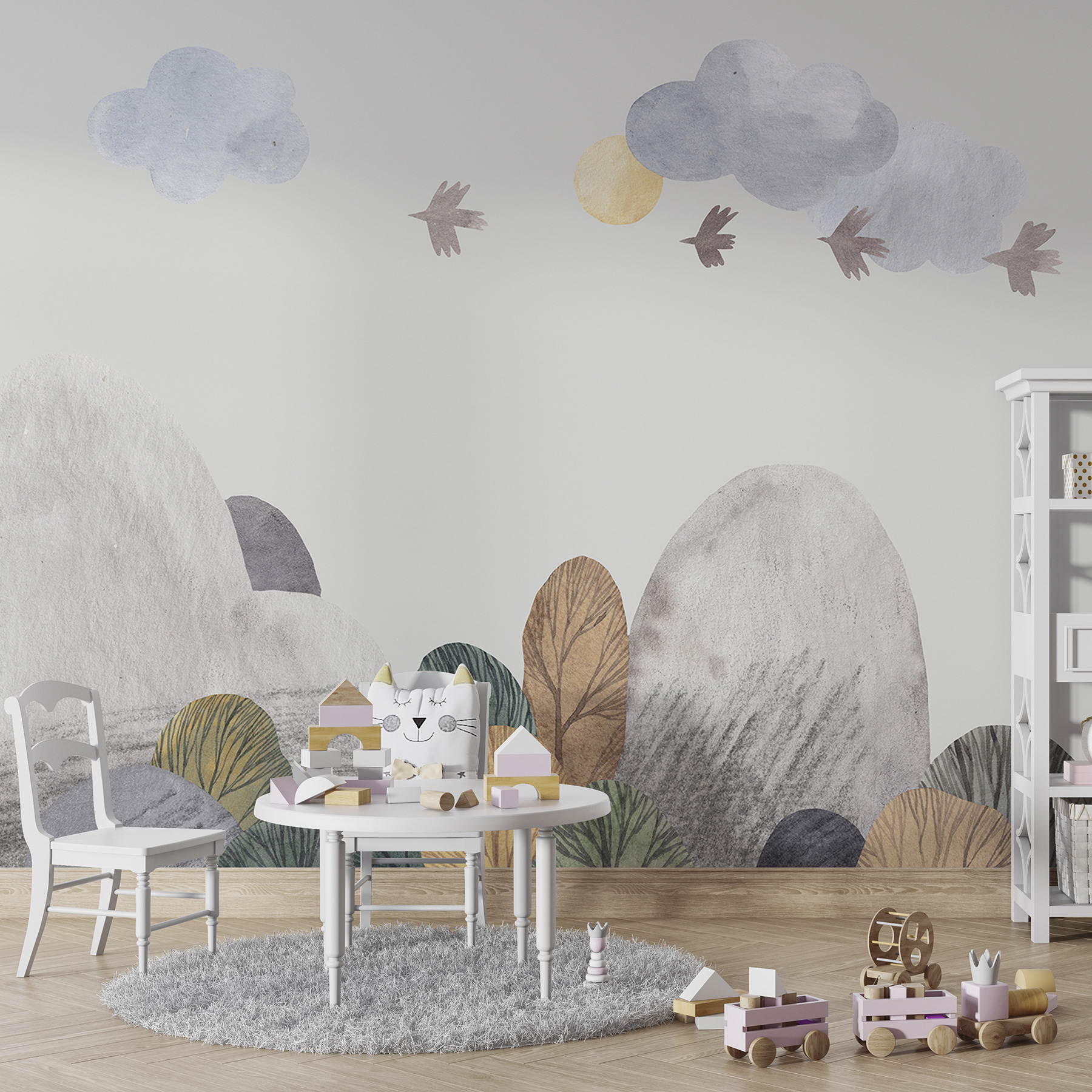Verfris je ruimte met deze charmante muurschildering met grillige vogels tegen een zacht witte achtergrond. Deze muurschildering is perfect om een serene sfeer toe te voegen aan kinderkamers of speelzalen, en een klein toevluchtsoord te creëren waar de verbeelding de vrije loop kan gaan. Stel je gezellige middagdutjes voor of avontuurlijke verhaaltjes met dit stukje natuur dat de wacht houdt. De zachte kleuren en het vriendelijke ontwerp maken het supermakkelijk om bij elk interieur te passen, of het nu pastel of levendig is. Het is alsof je een frisse wind in huis haalt – wie wil dat nou niet? Bovendien is het moeilijk om niet te glimlachen als die vogeltjes rondfladderen!