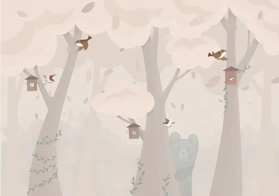Je kinderen zullen dol zijn op het spotten van de vogels en vogelhuisjes en misschien zelfs verhaaltjes verzinnen over de schattige beestjes die erin wonen. Bovendien is er een stiekeme beer die naar buiten gluurt, wat het hele tafereel een vriendelijke uitstraling geeft. Het voelt alsof je een sprookjesboek binnenstapt elke keer als je binnenkomt! Deze muurschildering is niet alleen decor; het is een hele magische wereld die uitnodigt tot verbeelding en verhalen vertellen.