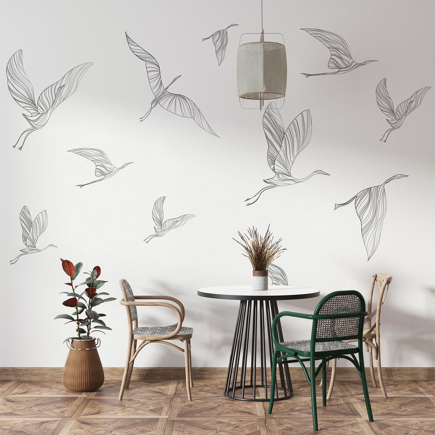 Heb je een muur die wel wat elegantie van de natuur kan gebruiken? Kijk dan eens naar deze muurschildering, “Drawing of a Bird”. Het is niet zomaar een muurschildering – het is een zachte, artistieke hint naar het buitenleven. Stel je voor dat je je kamer binnenloopt en deze sierlijke, lijngetekende vogels over je muur ziet zweven. Het heeft iets rustgevends, toch? Als het gefluister van een briesje of het zachte geflapper van vleugels.