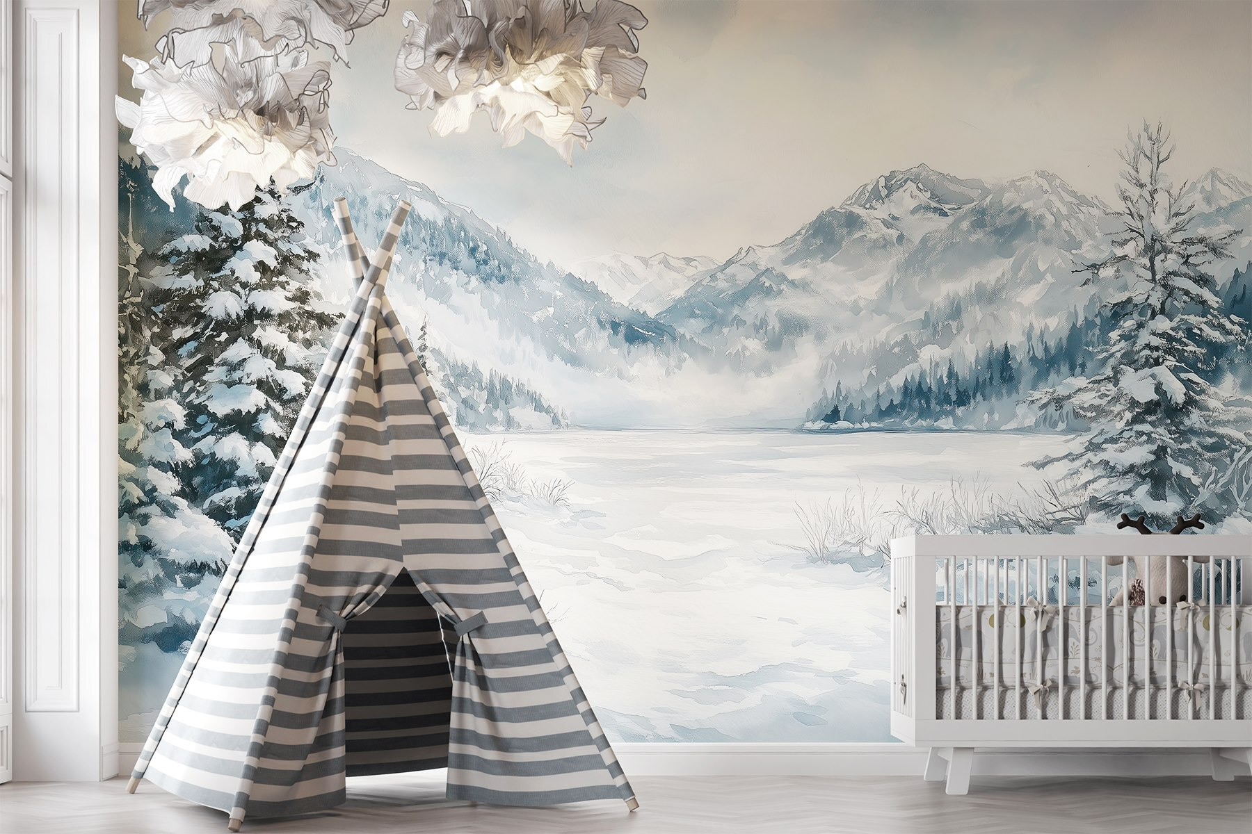 Tover je kamer om in een winterlandschap met deze prachtige muurschildering met een besneeuwd landschap, compleet met majestueuze bomen en bergen. Stel je voor dat je aan warme chocolademelk nipt terwijl je naar het serene tafereel staart. Het is alsof je de rust van een besneeuwd uitje naar je woonkamer brengt. De zachte witte en grijze tinten roepen een gezellige, vredige sfeer op, perfect om tot rust te komen na een lange dag. Stel je deze muurschildering voor als je achtergrond, die aanzet tot gesprekken en dagdromen over ijzige avonturen. Wie heeft er sneeuwlaarzen nodig als deze muurschildering de sfeer bepaalt? Ideaal voor iedereen die de schoonheid van de natuur wil omarmen zonder de kou!