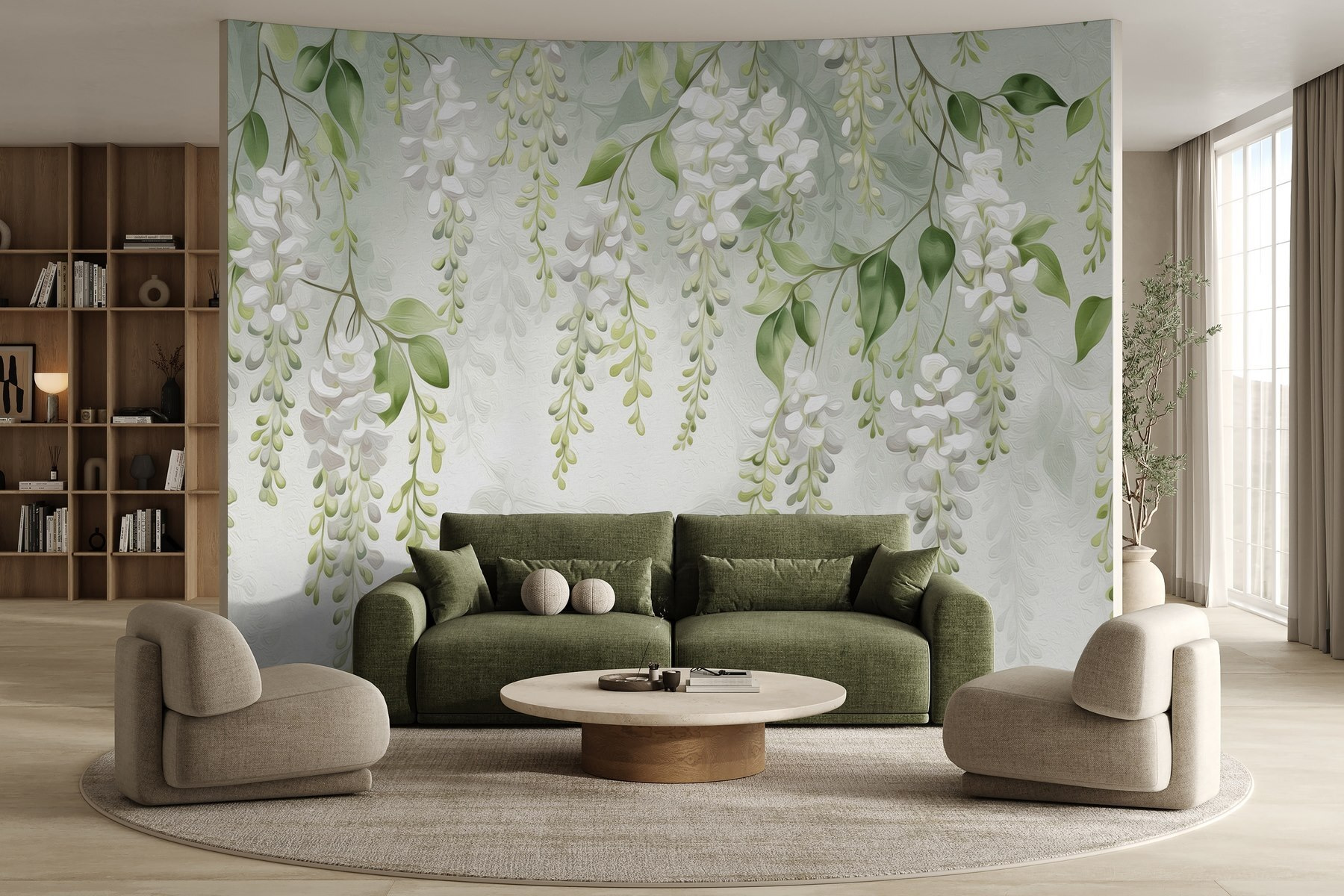 Tover elke ruimte om in een sereen toevluchtsoord met de muurschildering “Delicate Blossoms Hanging Gracefully Down”. Stel je voor: je loopt je woonkamer binnen en daar is het, een waterval van zachte witte bloesems die zachtjes voor je ogen wuiven. Het is alsof je een geheime tuin aan je muur hebt hangen – perfect om een rustige, zen sfeer te creëren. Het subtiele groen en wit zorgt voor een verfrissende touch, waardoor de kamer levendig en uitnodigend aanvoelt. Stel je voor dat je lekker wegkruipt met een goed boek, omarmd door bloemen. Het is niet zomaar decoratie; het is een stukje natuur om elke dag van te genieten!