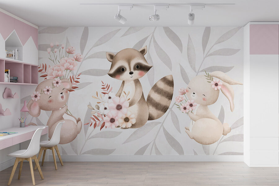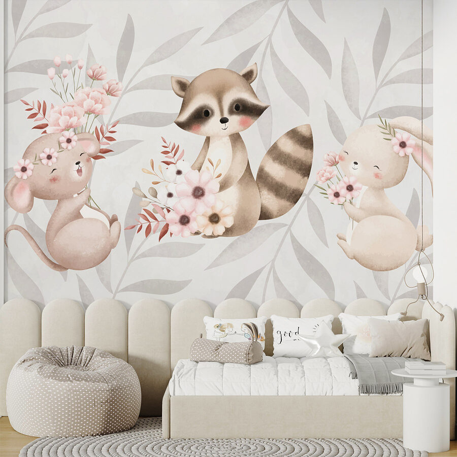 Tover een saaie muur om in een grillig oase met deze prachtige muurschildering van een wasbeer en een konijn die elk een boeket bloemen vasthouden. Het is alsof je een stukje natuur in huis haalt, waar deze charmante beestjes voor je ogen tot leven lijken te komen. Stel je voor dat je een kamer binnenstapt en meteen de glimlach van je gasten voelt. De neutrale tinten en zachte afbeeldingen creëren een gezellige sfeer, perfect voor kinderkamers, speelkamers of zelfs dat rustige leeshoekje dat je steeds weer wilt opknappen. Elke blik op deze schattige dieren kan een beetje vreugde opwekken en je eraan herinneren dat het leven soms om kleine dingen draait, zoals bloemen en harige vrienden. Het is een gespreksaanzet, een vleugje vrolijkheid en eerlijk gezegd, wie kan die schattige gezichtjes weerstaan?