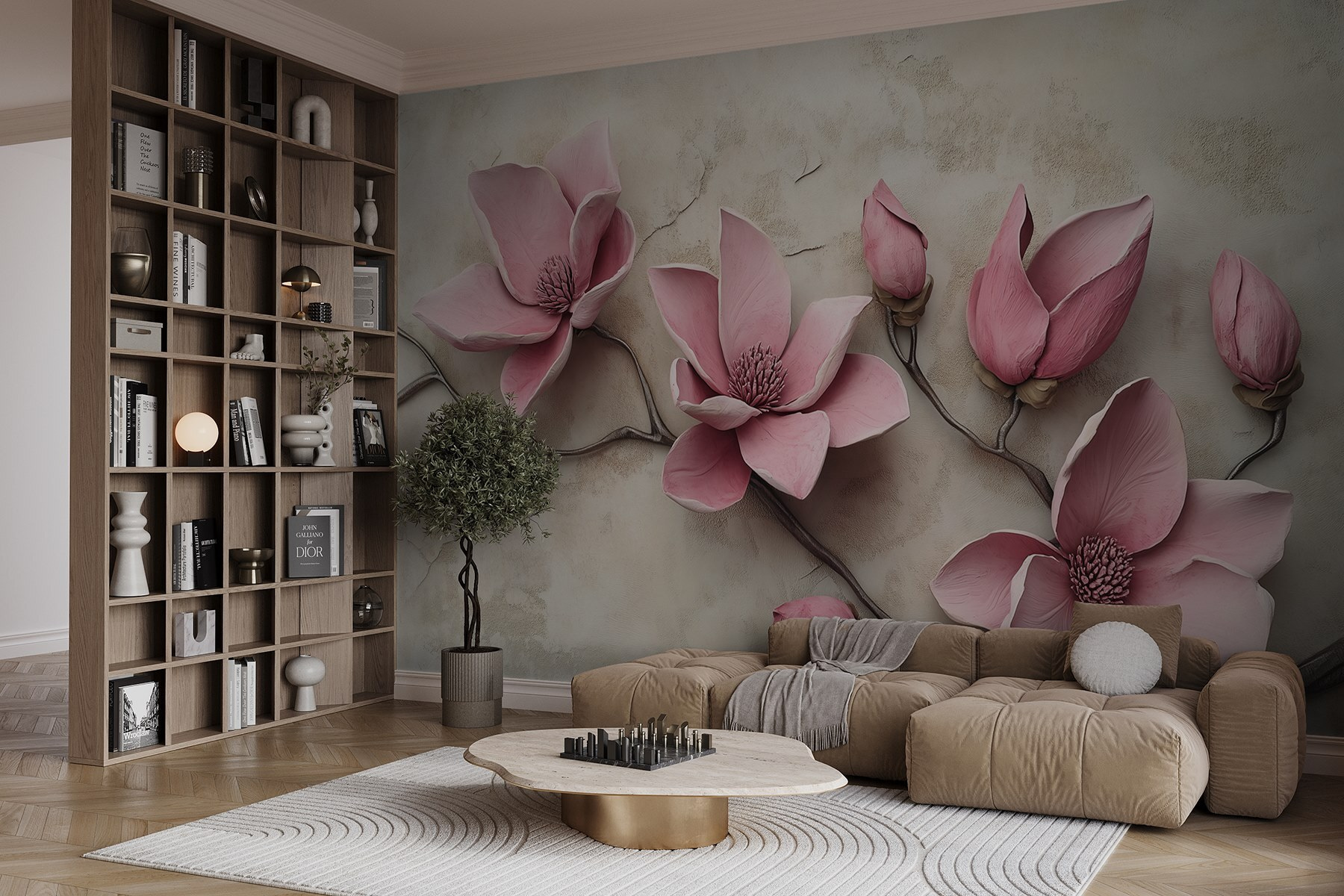 Verander je ruimte in een serene oase met deze prachtige muurschildering van roze bloemen op een zachte, witte achtergrond. Stel je voor dat je een vredige Japanse tuin binnenstapt, waar elke blik als een frisse wind aanvoelt. Deze delicate pioenrozen en rozen komen tot leven en nodigen uit tot warmte en vreugde in je huis. Het is net alsof je de lente naar binnen haalt, zonder niesallergieën. Het sierlijke ontwerp van deze muurschildering, perfect voor een gezellig hoekje of zelfs boven een mooie salontafel, geeft een vrolijke sfeer en is een heerlijke achtergrond voor elke bijeenkomst. Vertrouw erop dat deze decoratie je gasten zal charmeren en je humeur dagelijks zal opvrolijken!