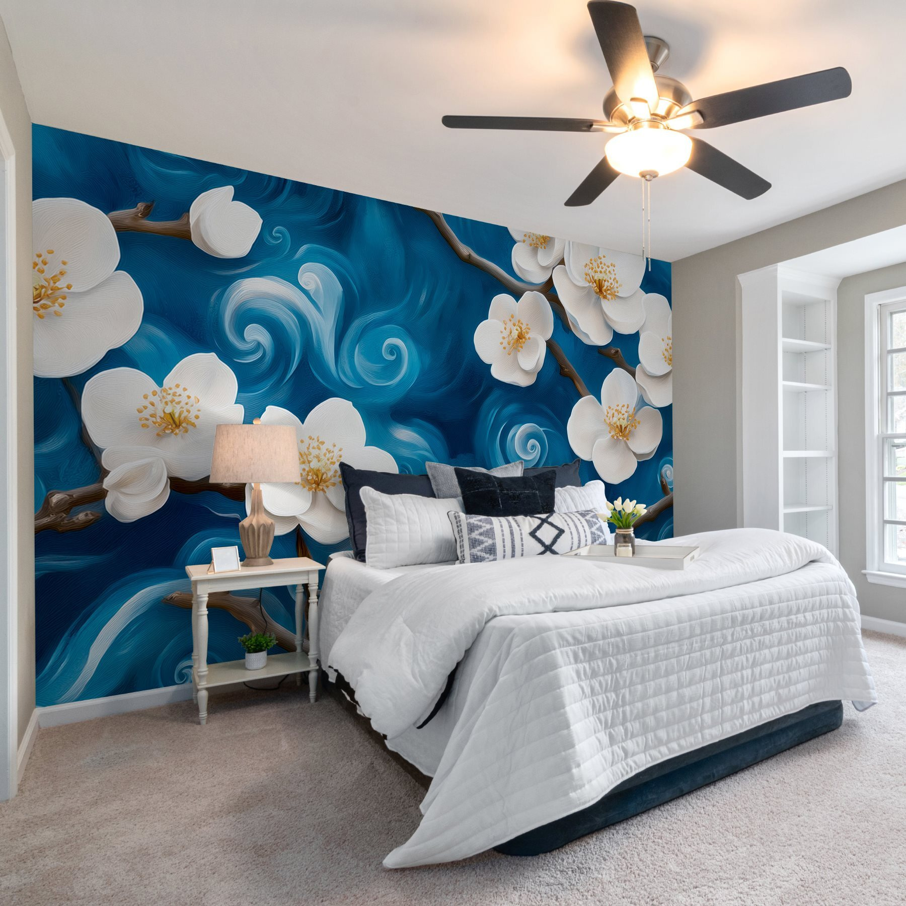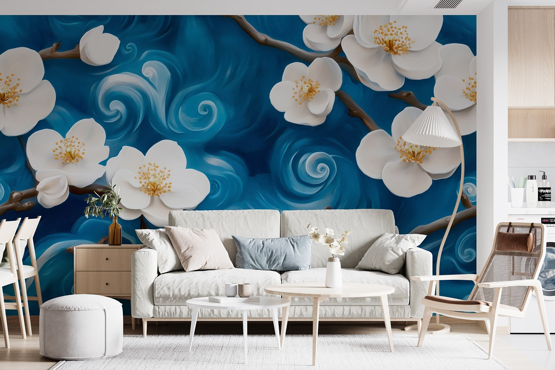 Stel je voor dat je je kamer binnenstapt en wordt begroet door zachte bloesems die dansen tegen een wervelende achtergrond – klinkt dromerig, toch? Deze muurschildering, “Delicate Blossoms Against a Swirling Backdrop”, brengt de charme van een Japanse tuin rechtstreeks naar je ruimte. Het opvallende contrast van zachte witte bloemblaadjes tegen diepblauwe wervelingen creëert een serene maar dynamische sfeer. Het is alsof je elke keer dat je binnenkomt een minivakantie hebt! Perfect voor die momenten waarop de chaos van de wereld binnensluipt. Stel je voor dat je lekker in je favoriete stoel zit, met een kopje thee in je hand. Met deze muurschildering vergeet je gemakkelijk de drukte buiten en raak je verdwaald in de schoonheid ervan. Ook een leuk gespreksonderwerp – wie wil er nu niet praten over zo’n prachtige achtergrond? Verander je muren in een rustige toevluchtsoord!