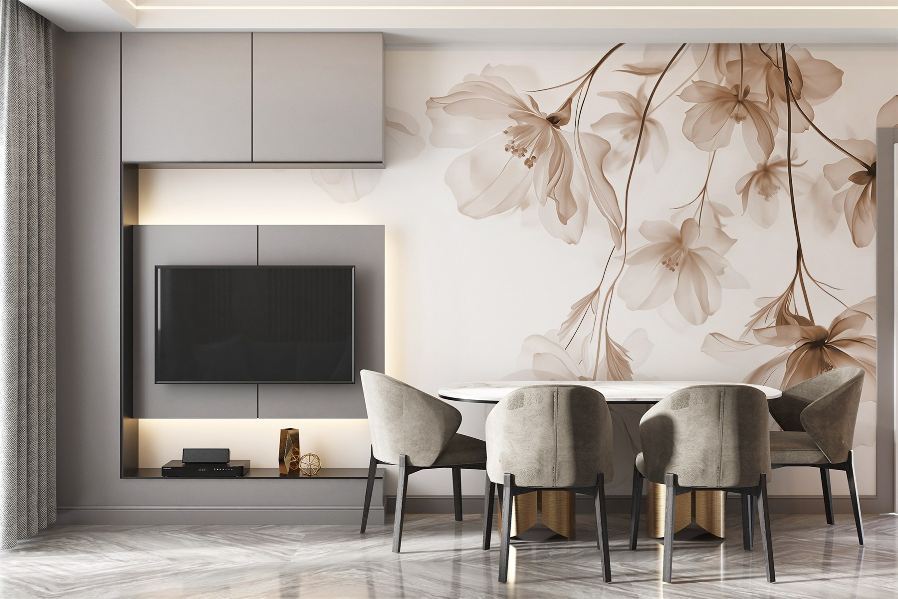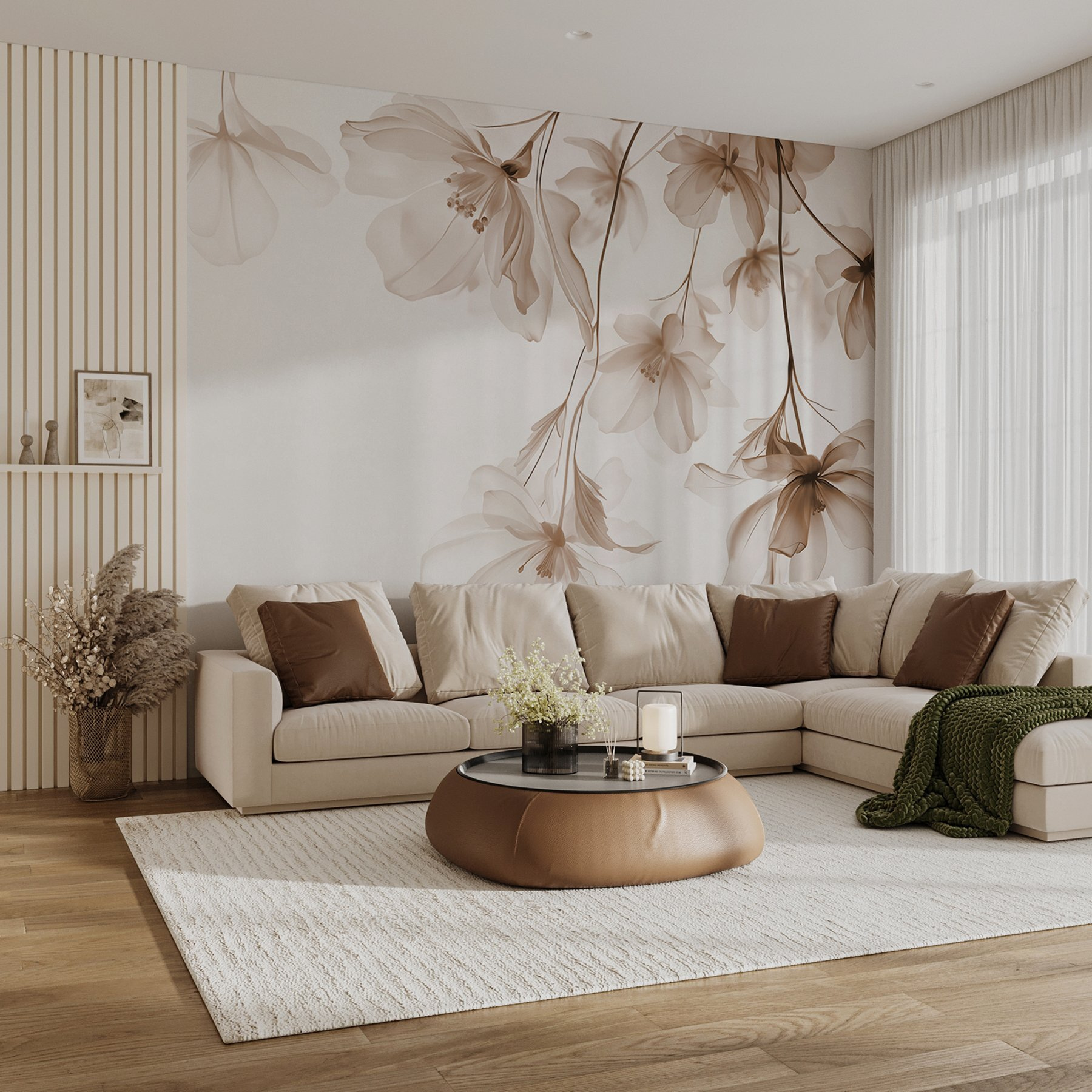 Transformeer elke ruimte met deze prachtige muurschildering met delicate bloemen in zachte tinten. Stel je voor dat je vanuit je woonkamer een serene tuin binnenstapt – elke bloem fluistert rust uit alsof het schilderij van de natuur tot leven is gekomen. Het is niet alleen een decor; het is een ervaring. Stel je voor dat je vrienden ontvangt en dat hun gesprekken naar de achtergrond verdwijnen terwijl ze dit prachtige schouwspel bewonderen. De zachte kleuren zorgen voor warmte in de kamer, waardoor deze open en uitnodigend aanvoelt. Perfect om een vredige sfeer te creëren. Een stukje paradijs aan de muur.