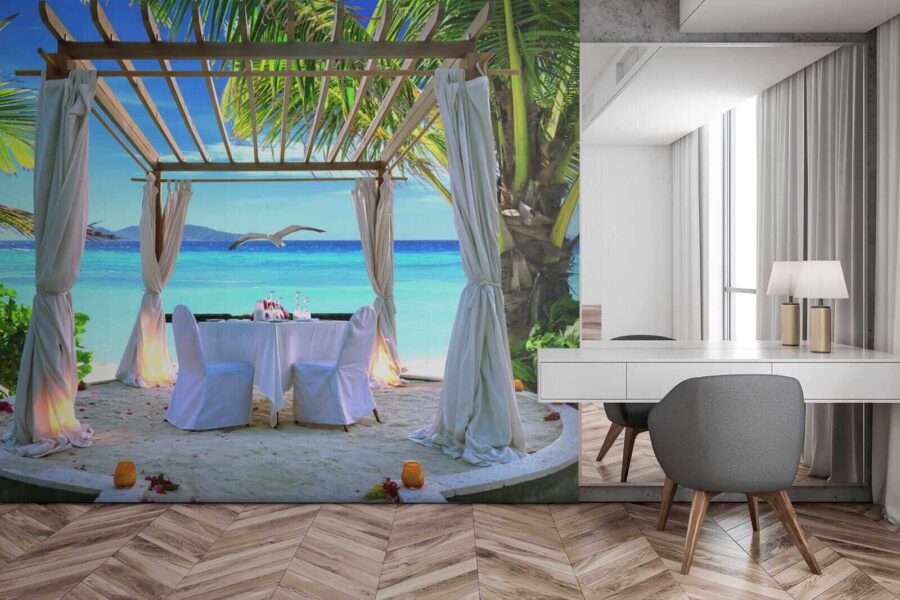 Stel je voor dat je een stukje paradijs binnenstapt zonder je huis te verlaten. Deze levendige muurschildering, “Wall Murals Table Set Up on a Beach”, nodigt je uit om achterover te leunen in je woonkamer en weg te dromen bij het idee van zand tussen je tenen en een zeebriesje. Stel je een romantisch diner voor onder wuivende palmbomen en met het geluid van zachte golven op de achtergrond. Het is alsof je elke keer dat je ernaar kijkt een minivakantie beleeft! Met zijn levendige kleuren en tropische sfeer brengt deze muurschildering elke ruimte tot leven. Perfect voor dagdromers en strandliefhebbers, het is de perfecte balans tussen ontspanning en avontuur. Haal een beetje strandmagie in huis – wie wil dat nou niet?