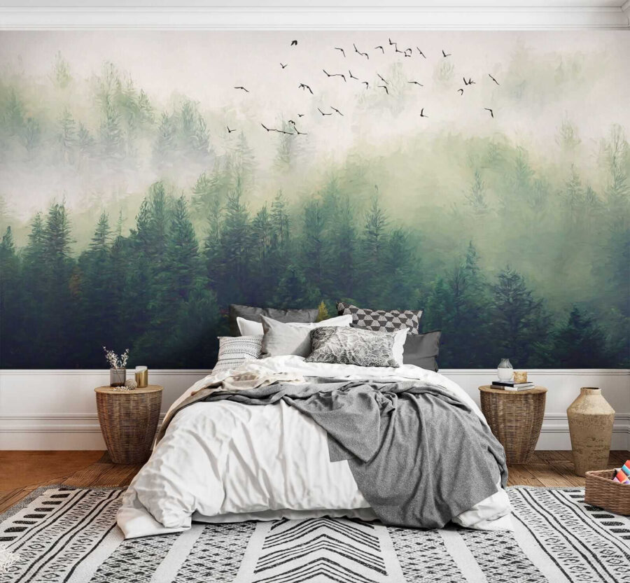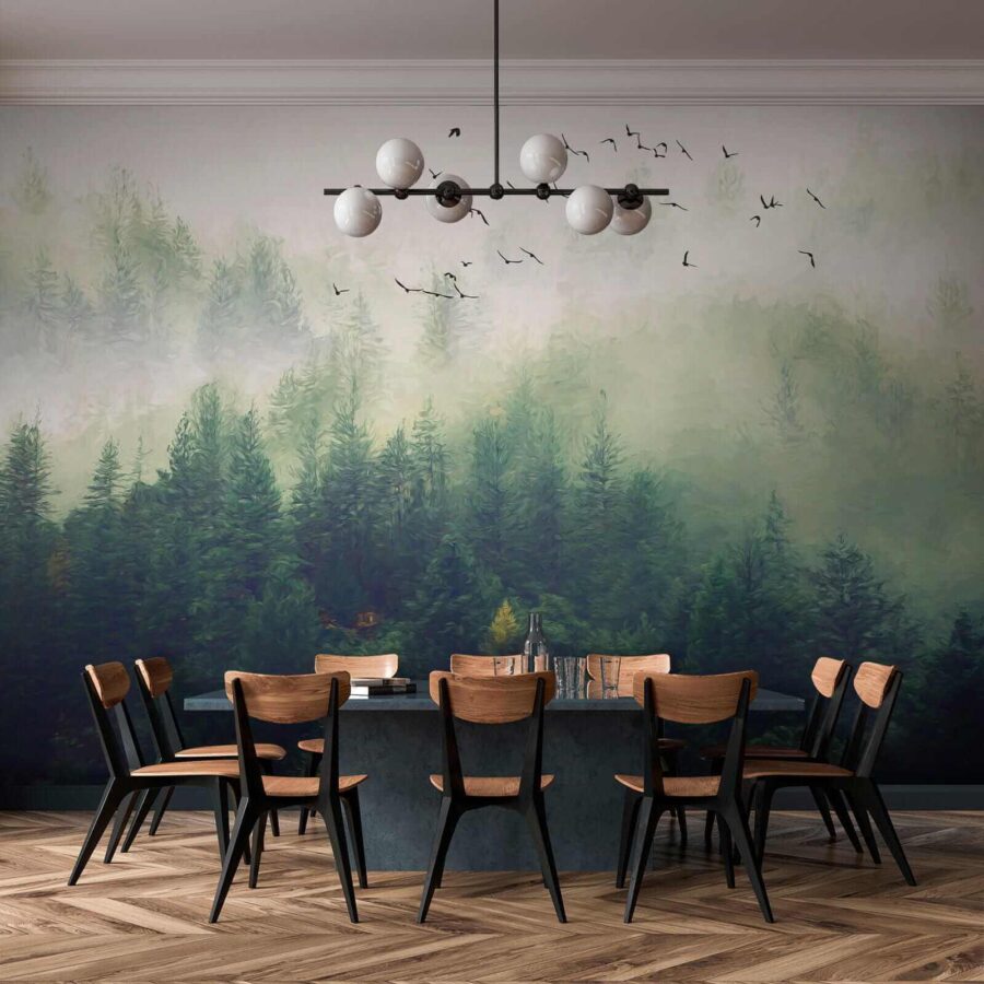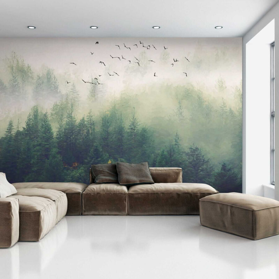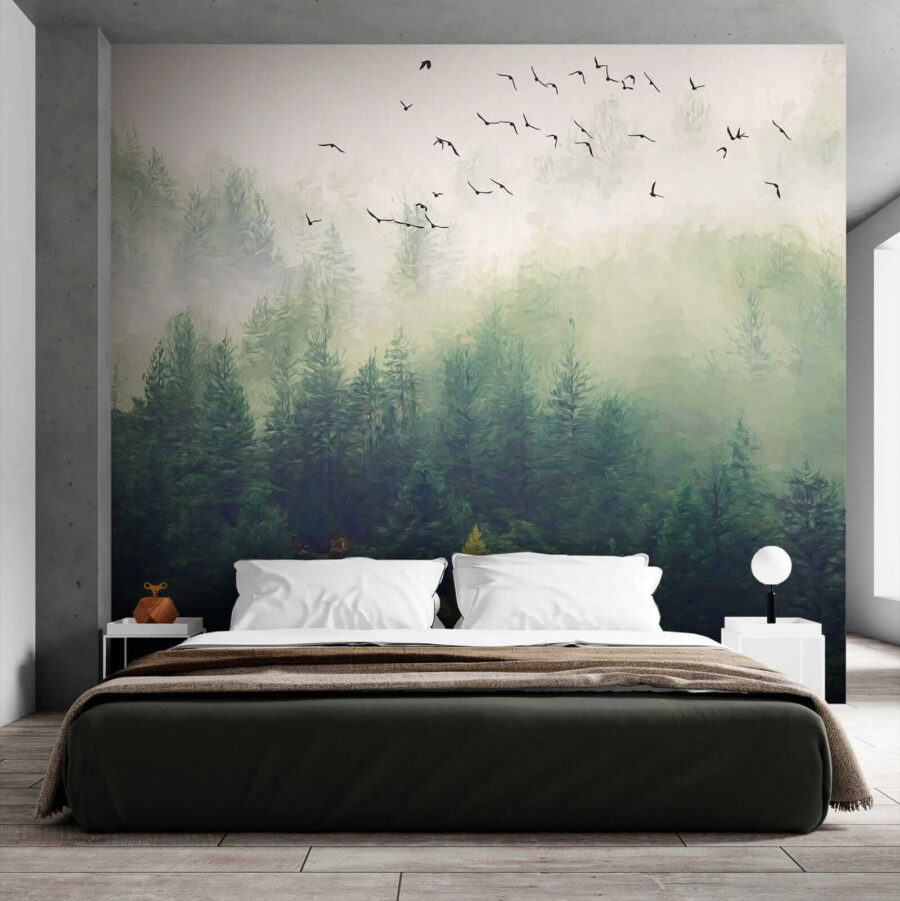 Transformeer uw ruimte met deze prachtige muurschildering met vogels die boven een mistig bos vliegen. Stel u voor dat u uw woonkamer binnenstapt en u zich in een serene omgeving bevindt! De zachte groene tinten en de lichte mist omhullen u als een knusse deken, terwijl de vogels u lijken uit te nodigen om mee te gaan op hun reis. Het is alsof de natuur heeft besloten om zelf uw interieur te decoreren!